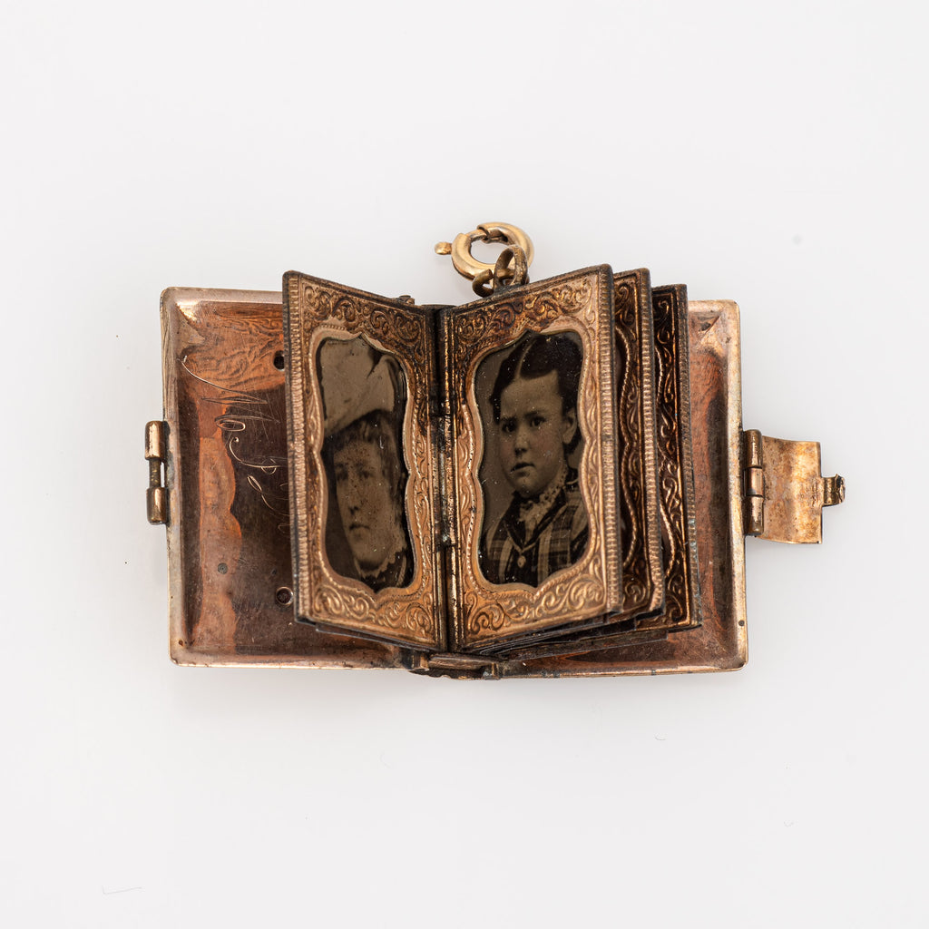 Finely detailed antique Victorian family book locket (circa 1860s to 1880s), crafted in 14k rose gold.