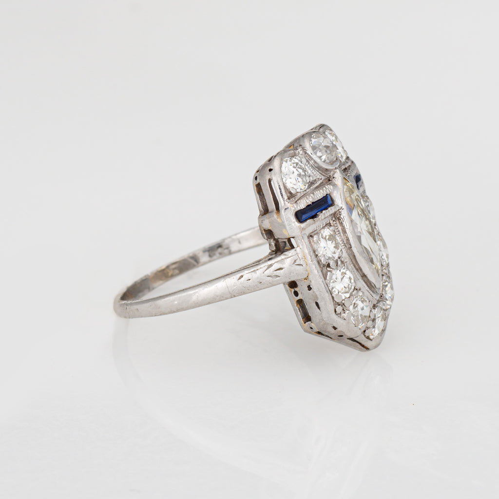 Vintage Art Deco Diamond Sapphire Sheild Ring Sz 5.75 Platinum Jewelry 1920s