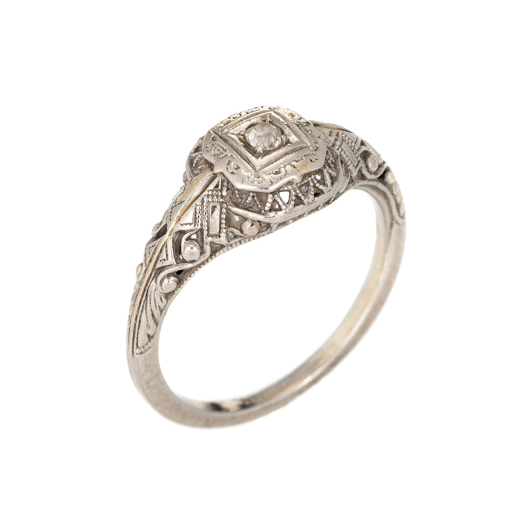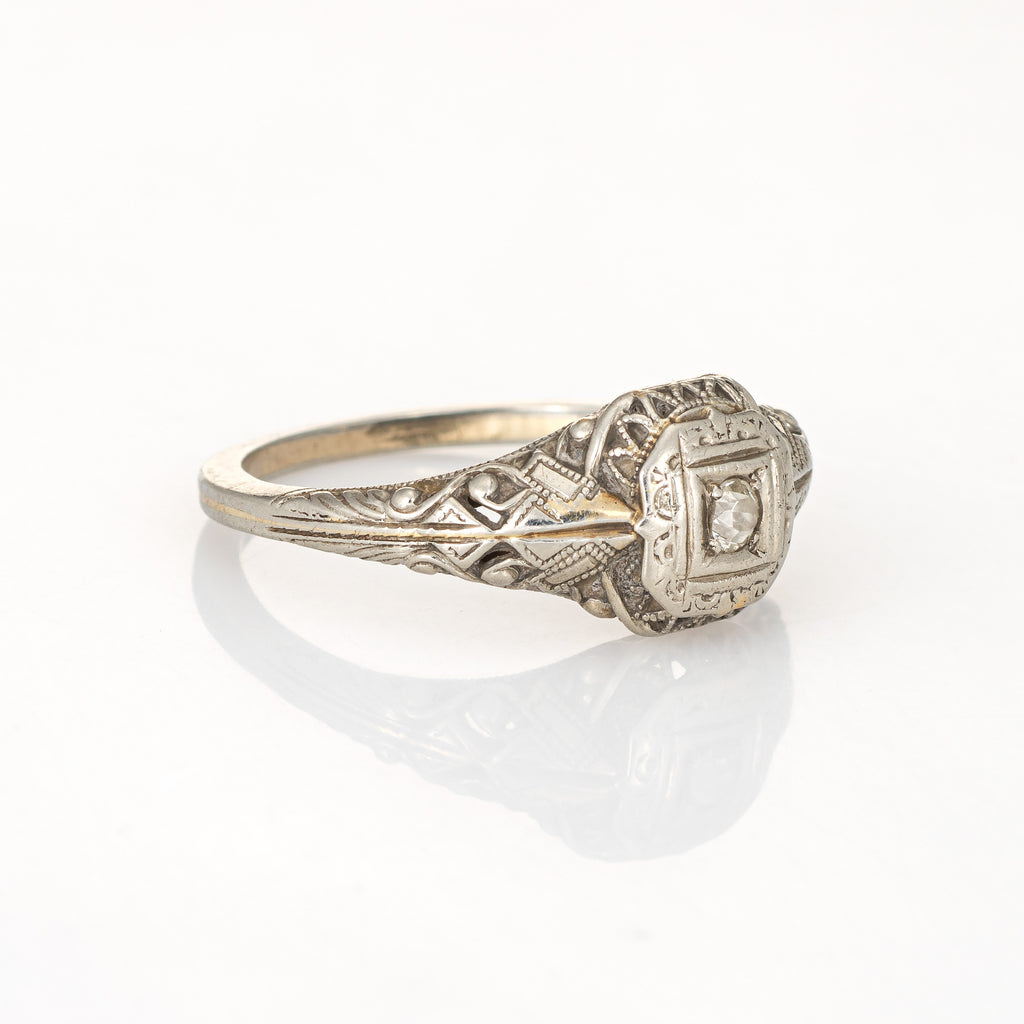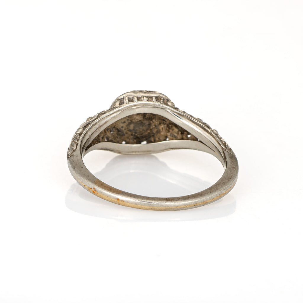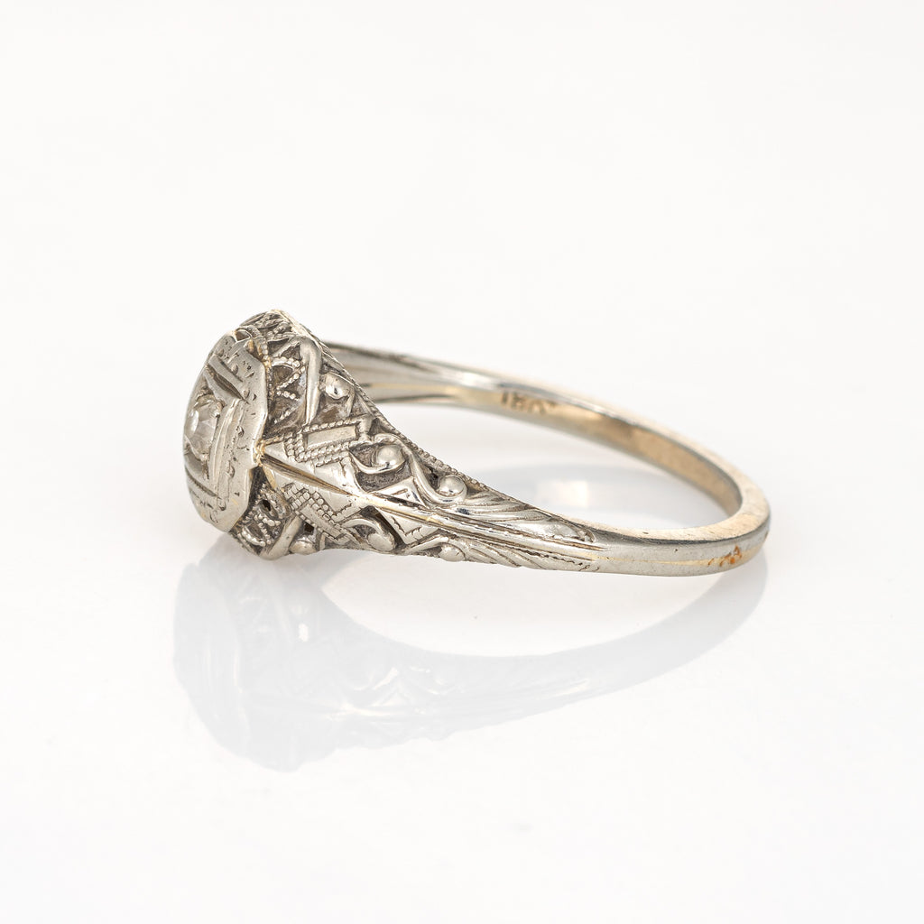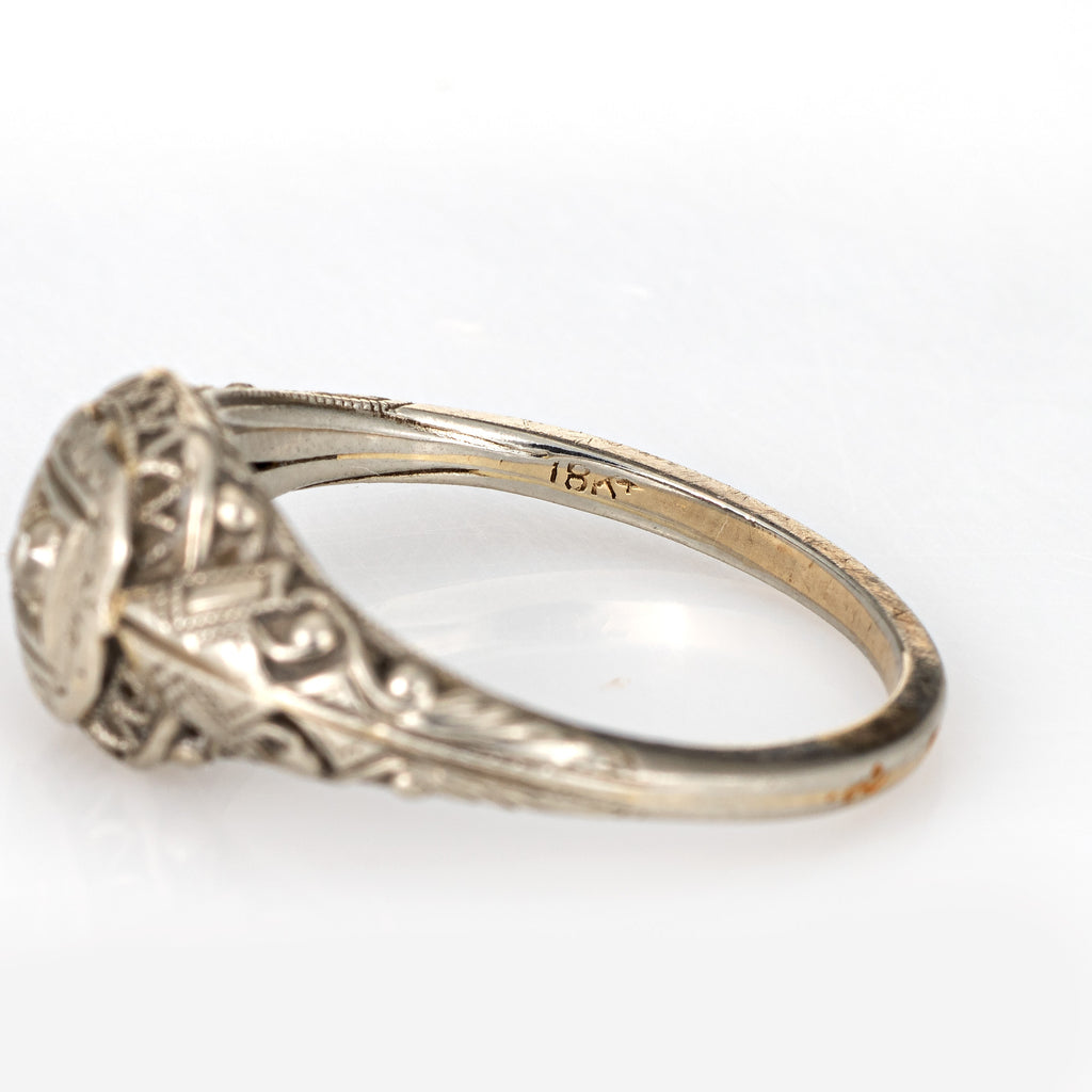 Finely detailed vintage Art Deco era ring (circa 1920s to 1930s) crafted in 18 karat white gold.