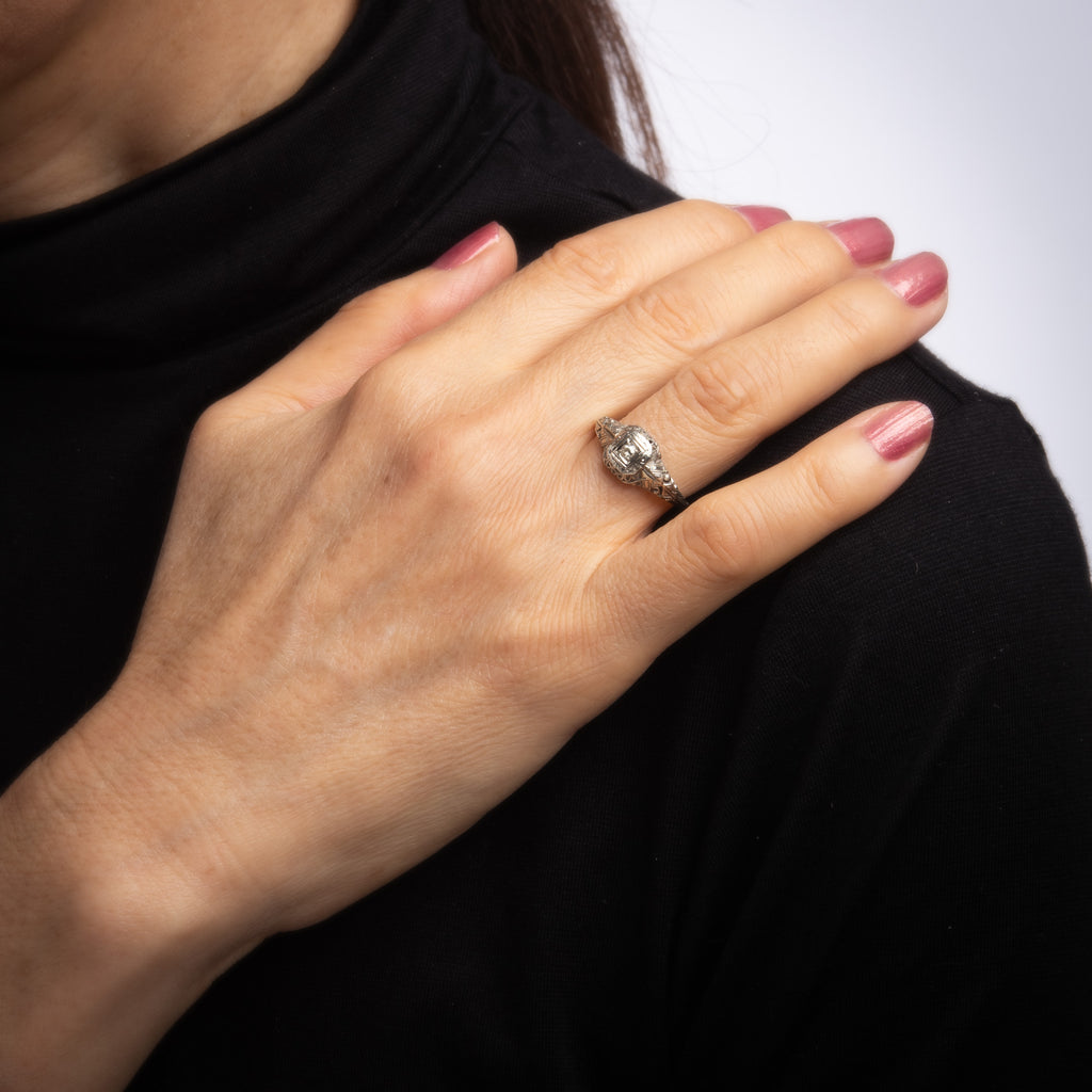 The Old Mine cut diamond is set into a low rise (4mm - 0.15 inches) square filigree mount. The side shoulders are decorated with milgrain and etched foliate detail. The ring sits nicely on the finger. Ideal worn as an alternative engagement ring or a right hand ring for everyday wear.