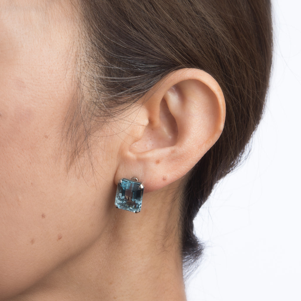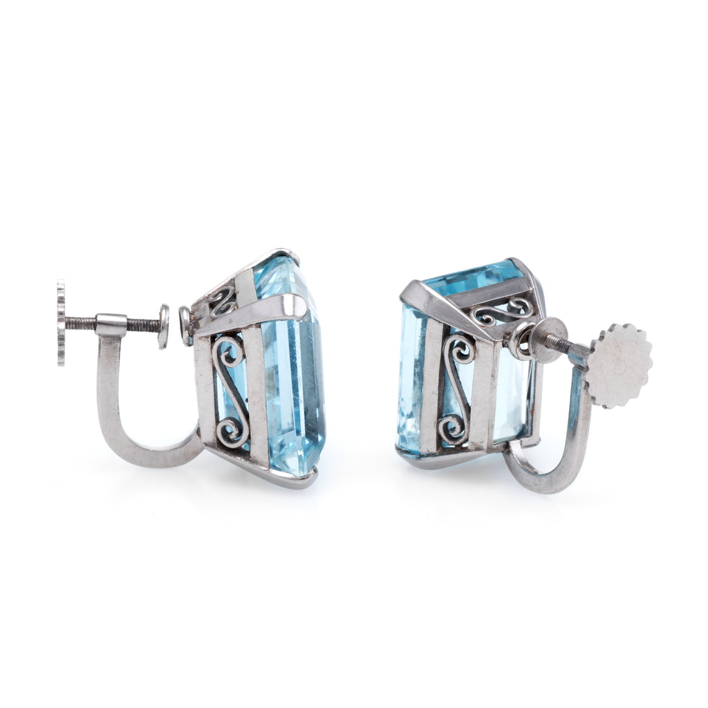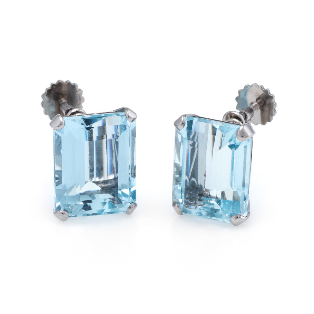 Stones:  Emerald cut aquamarines each measure 14mm x 11mm (estimated at 9 carats each - 18 carats total estimated weight). The aquamarines are in excellent condition and free of cracks or chips.