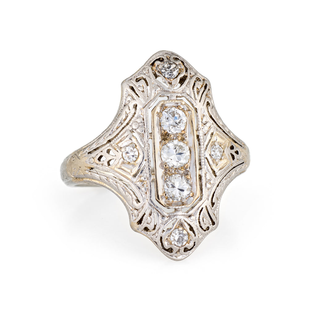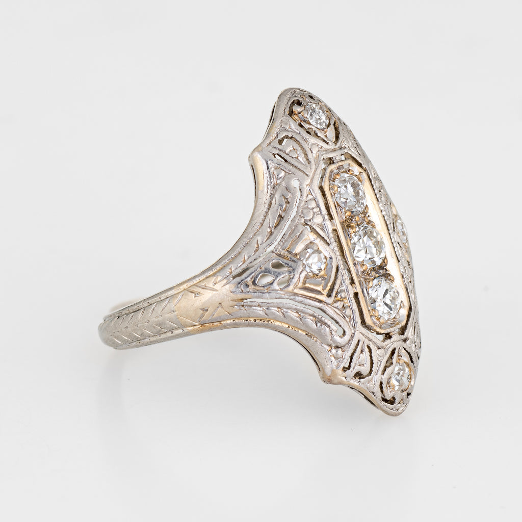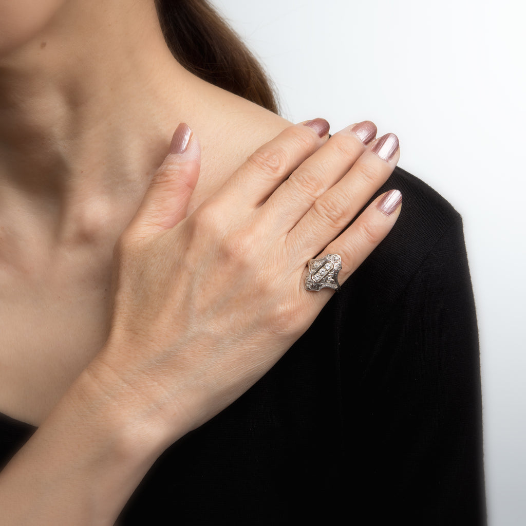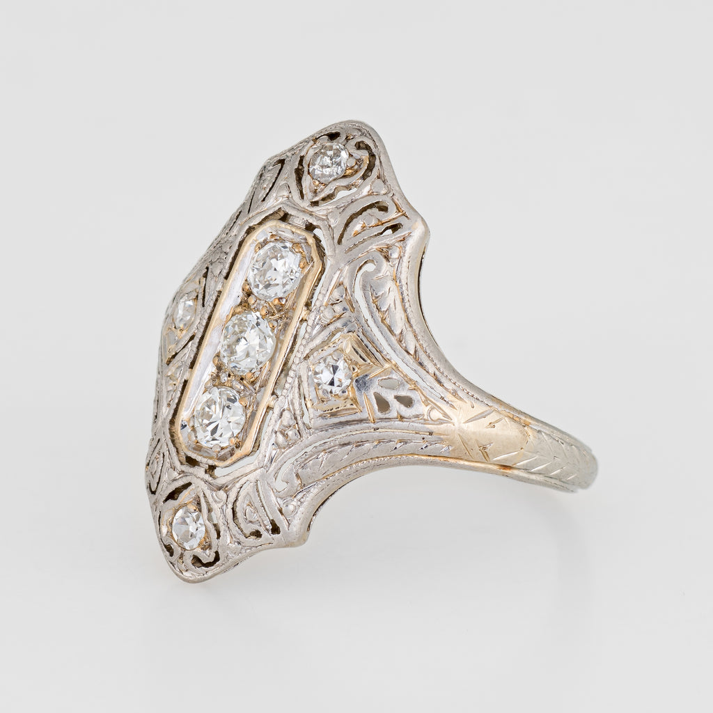 The ring features a lacy filigree design with an elongated mount, a hallmark of the Art Deco era. The mount has a slightly curved saddle for a comfortable fit on the finger. The ring has a low profile rising 3.5mm from the finger (0.13 inches).
