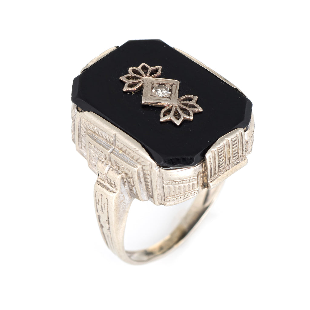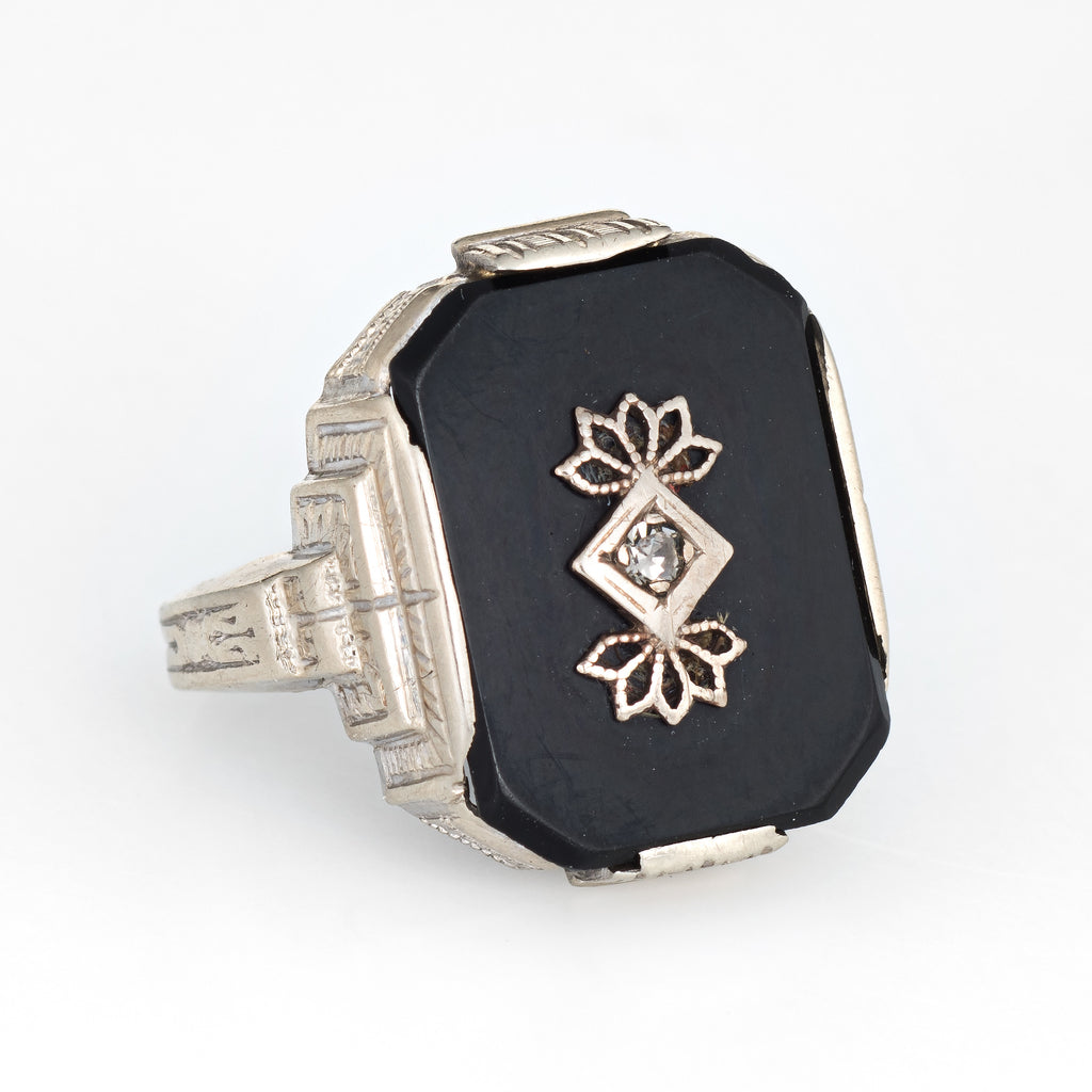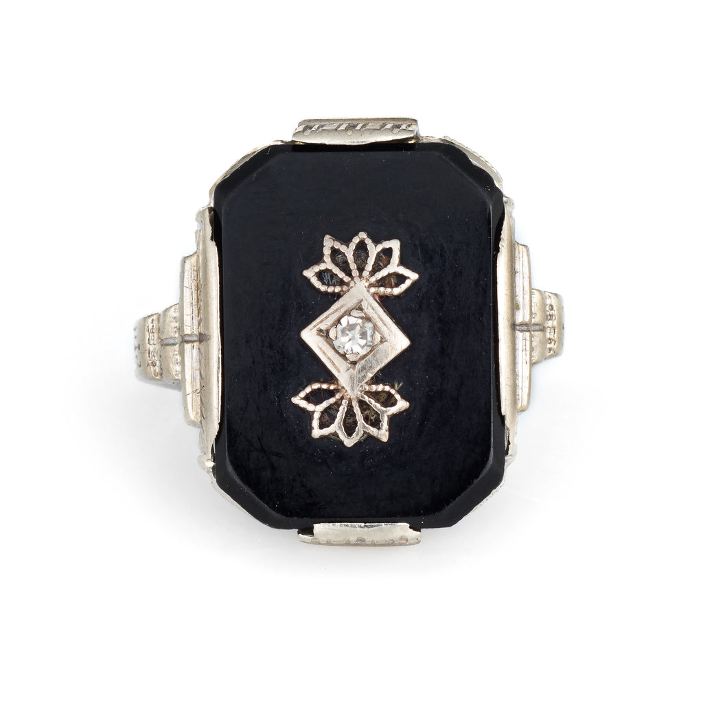 Stones: Centrally mounted estimated 0.02 carat single cut diamond is estimated at H-I color and SI1 clarity). The onyx measures 17mm x 12mm. The onyx is in excellent condition and free of cracks or chips.