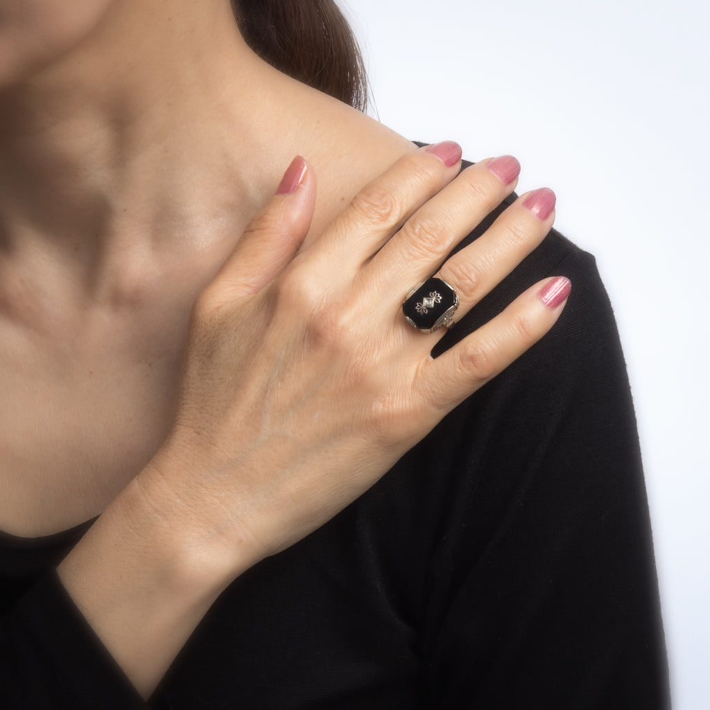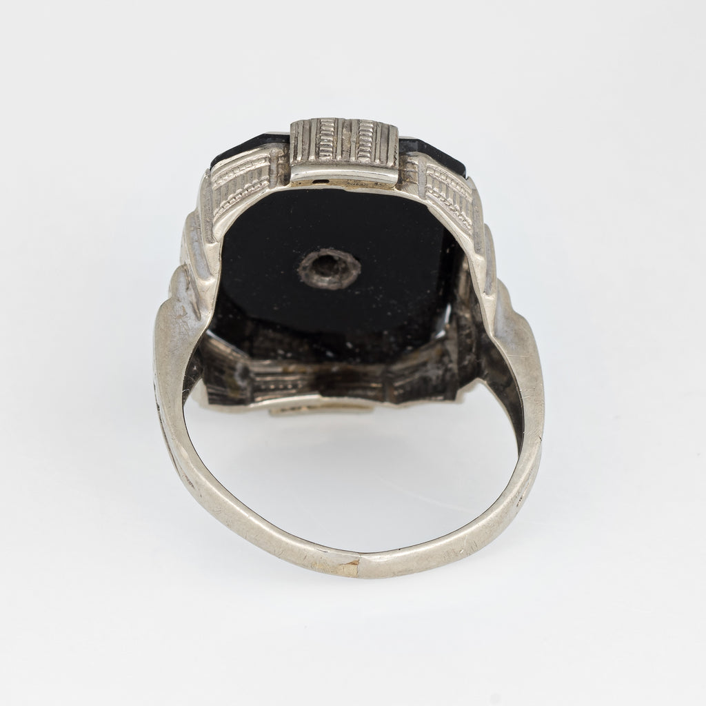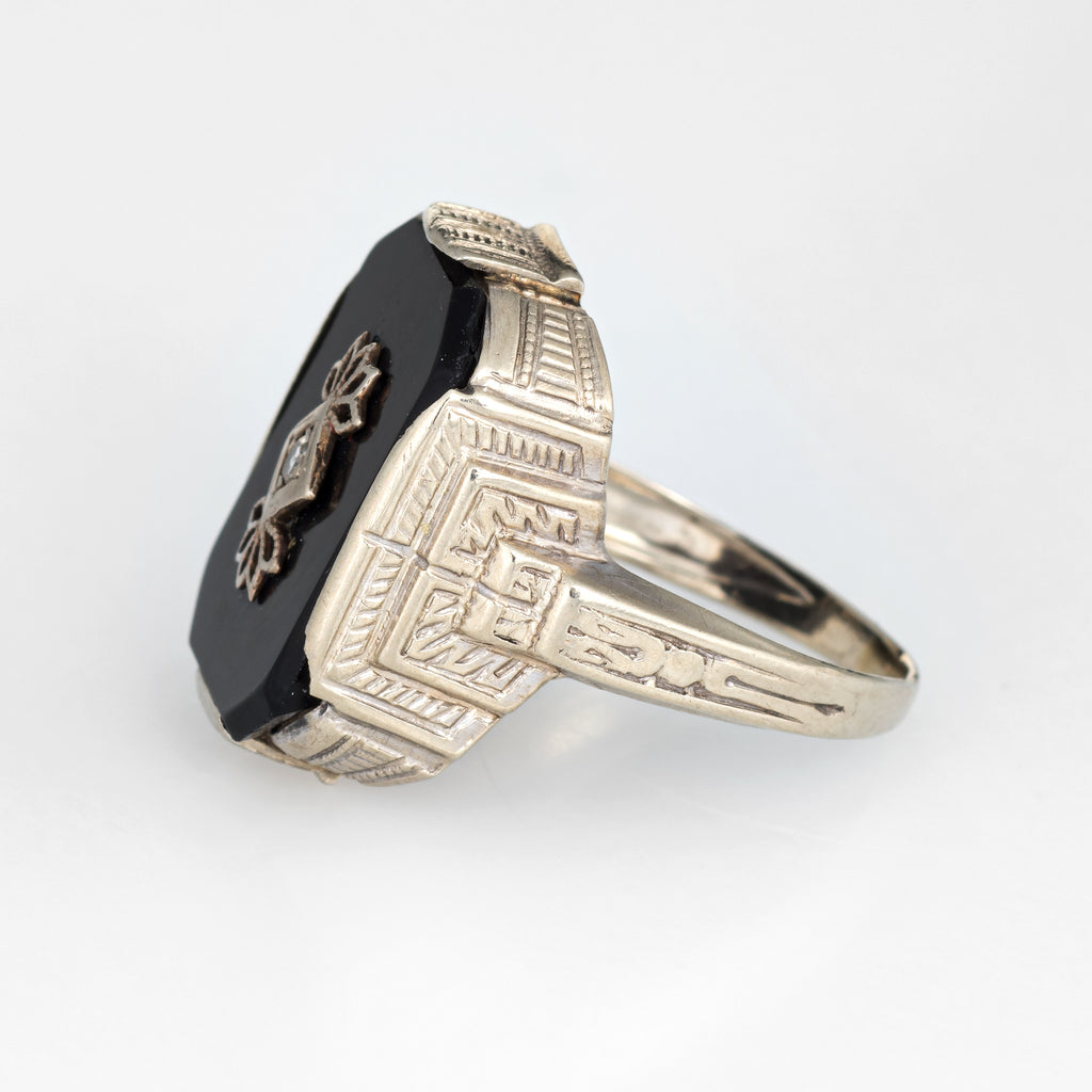 Stones: Centrally mounted estimated 0.02 carat single cut diamond is estimated at H-I color and SI1 clarity). The onyx measures 17mm x 12mm. The onyx is in excellent condition and free of cracks or chips.