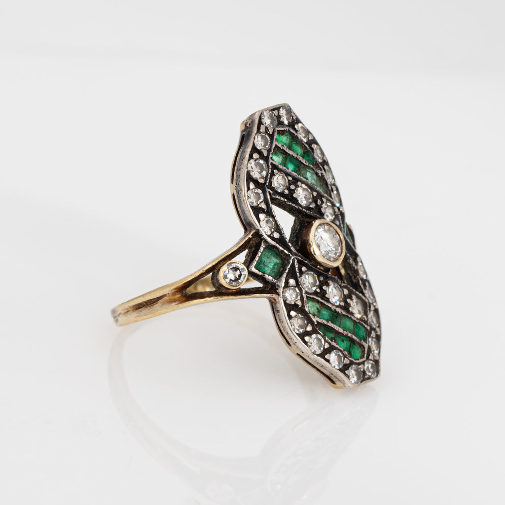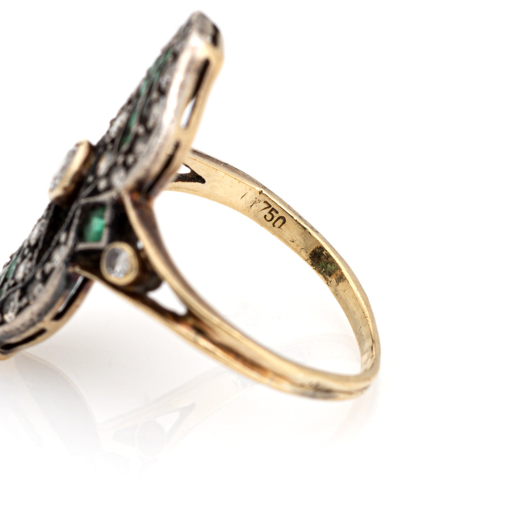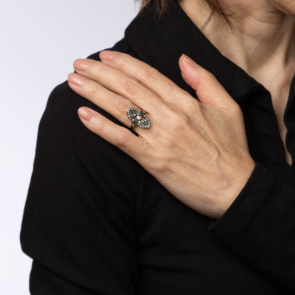 The distinct cocktail ring is designed in the Art Deco style highlights sparkling diamonds and accenting emeralds. Bold in color and style the ring makes a great statement on the hand. The low rise ring (3mm - 0.11 inches) sits comfortably on the finger.