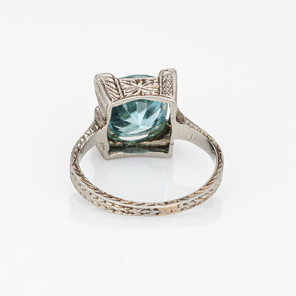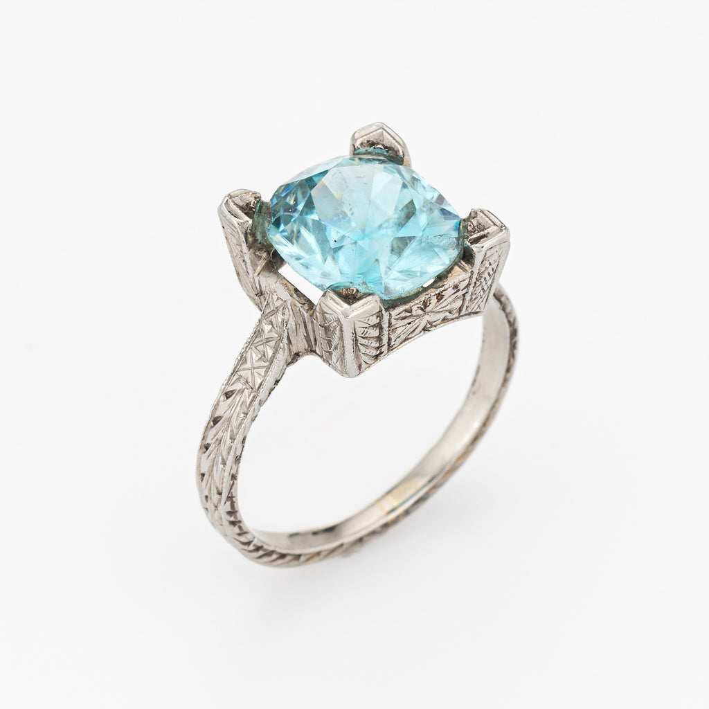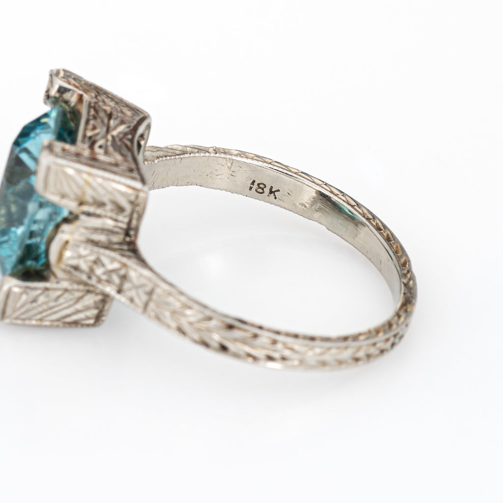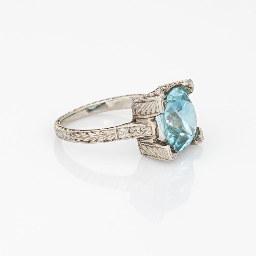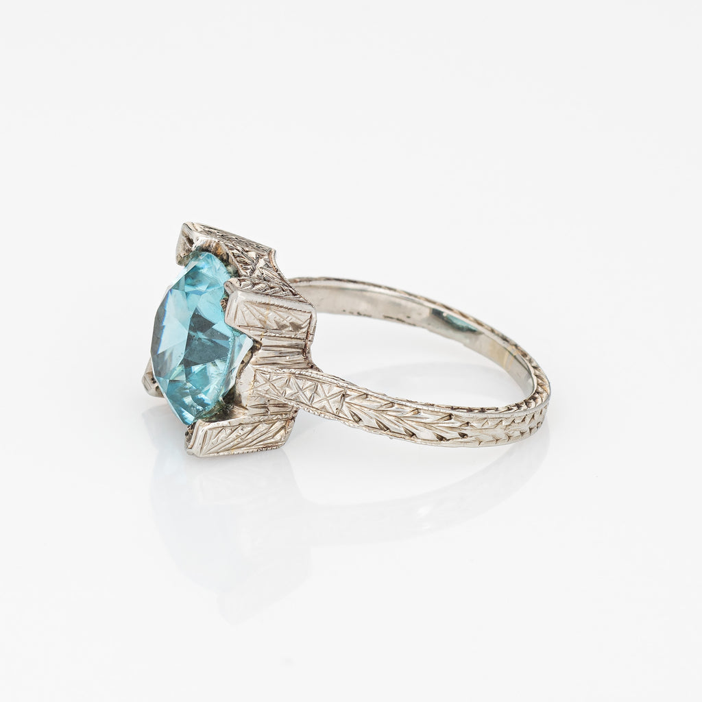 Finely detailed vintage Art Deco era blue zircon ring (circa 1920s to 1930s) crafted in 18k white gold.