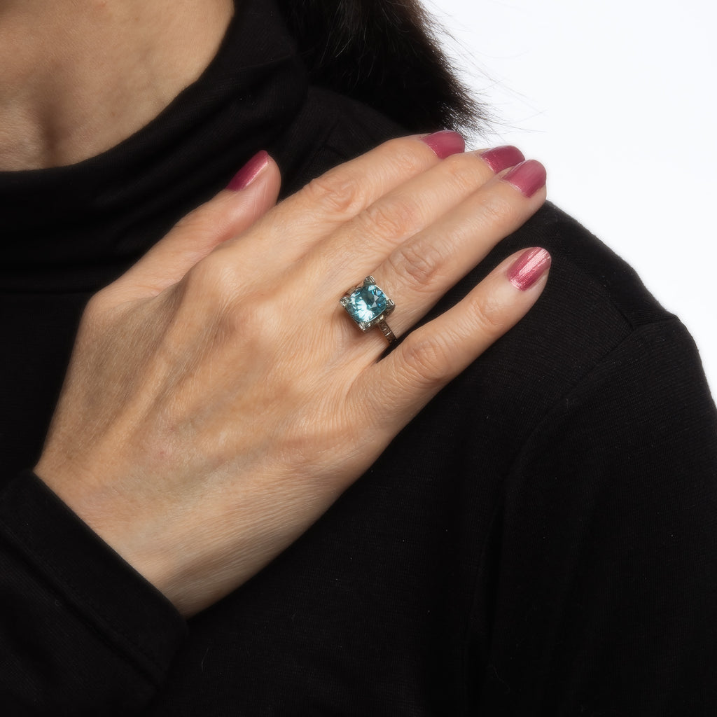 The stylish Art Deco era ring features a bright sparkling blue zircon, set into a square setting. The under gallery and shoulders feature a pretty etched foliate design. The ring has a lower profile and rises 6mm from the finger (0.23 inches). The ring would make a lovely alternative engagement ring or right hand ring for every day wear.