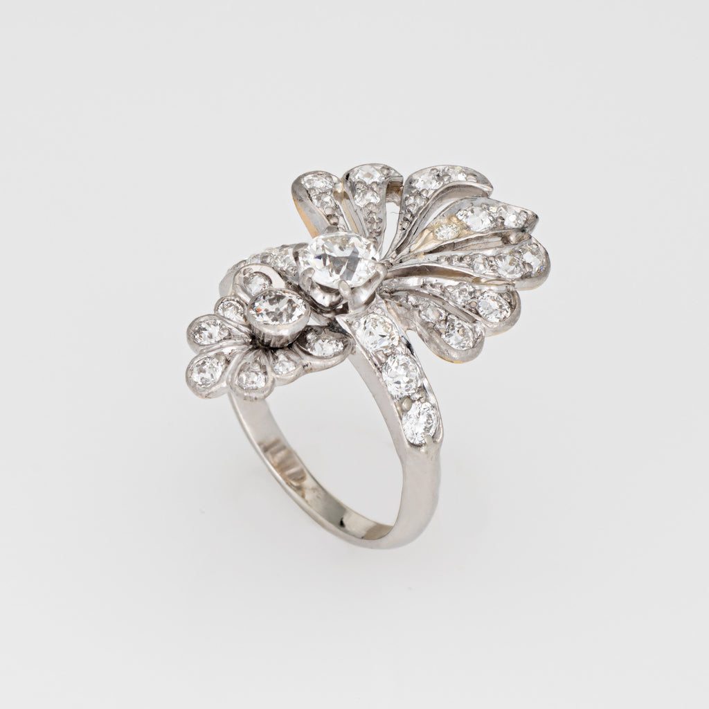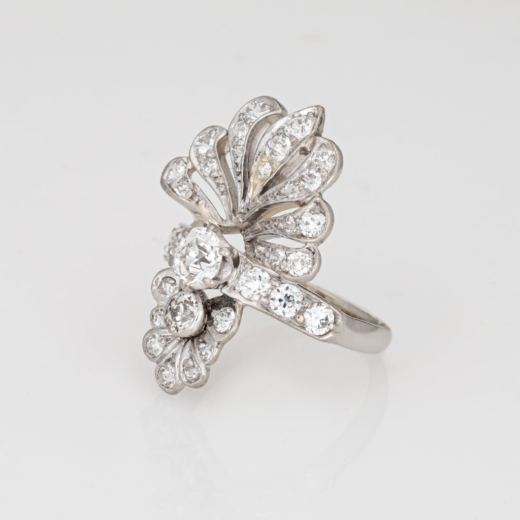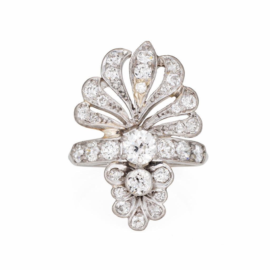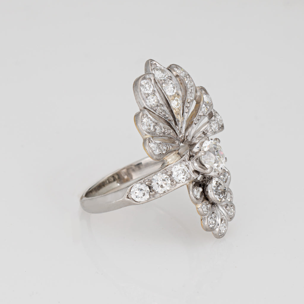 The stylish Art Deco era ring features a cluster of sparkling Old Mine and European cut diamonds set into a peacock-like design. The distinct style makes a beautiful and unique statement on the hand! The ring has a lower profile and rises 5mm from the finger (0.19 inches).