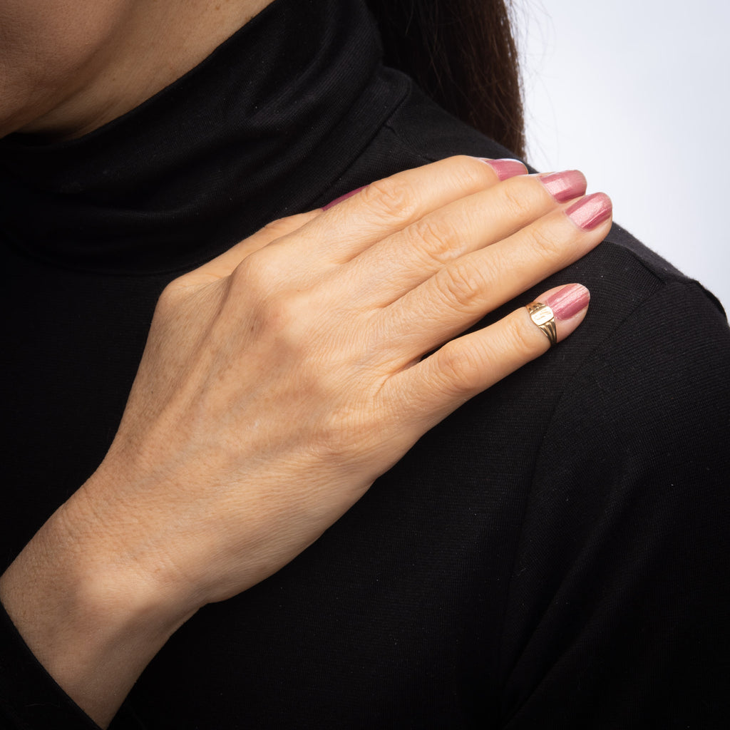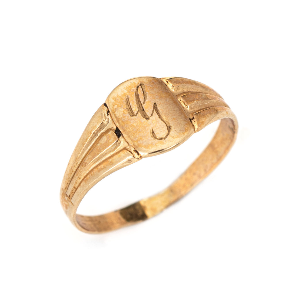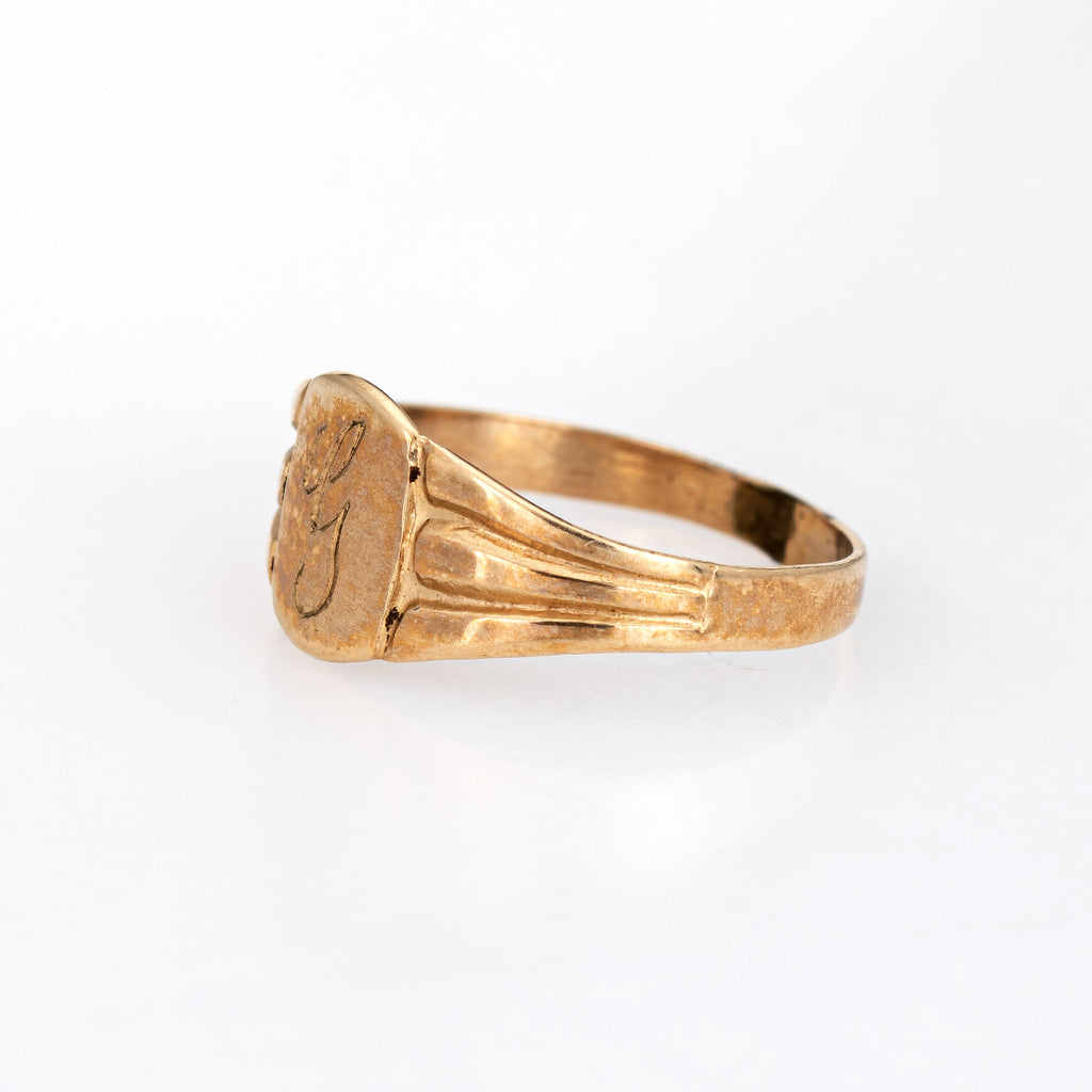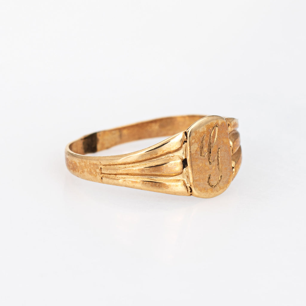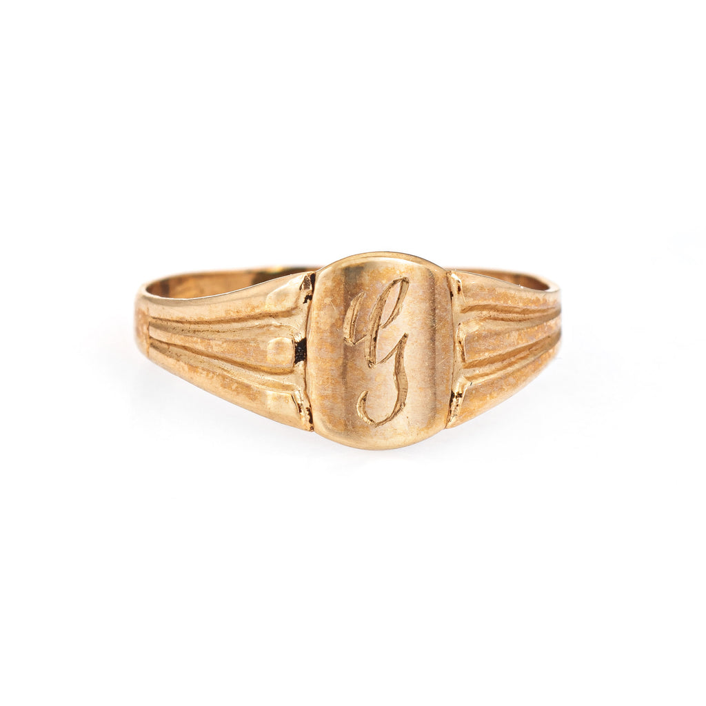 The sweet Art Deco era baby signet ring is engraved with the letter 'G' in old cursive font. The side shoulders feature column detail. The petite ring is ideal worn on a chain as a pendant or as a midi ring if desired.