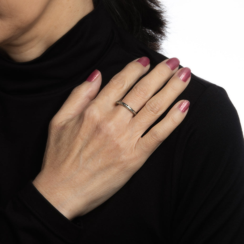 Size & Measurements: The ring is a size 8 1/2 (sizable). The band measures 3mm wide (0.11 inches), rising 2mm from the finger.