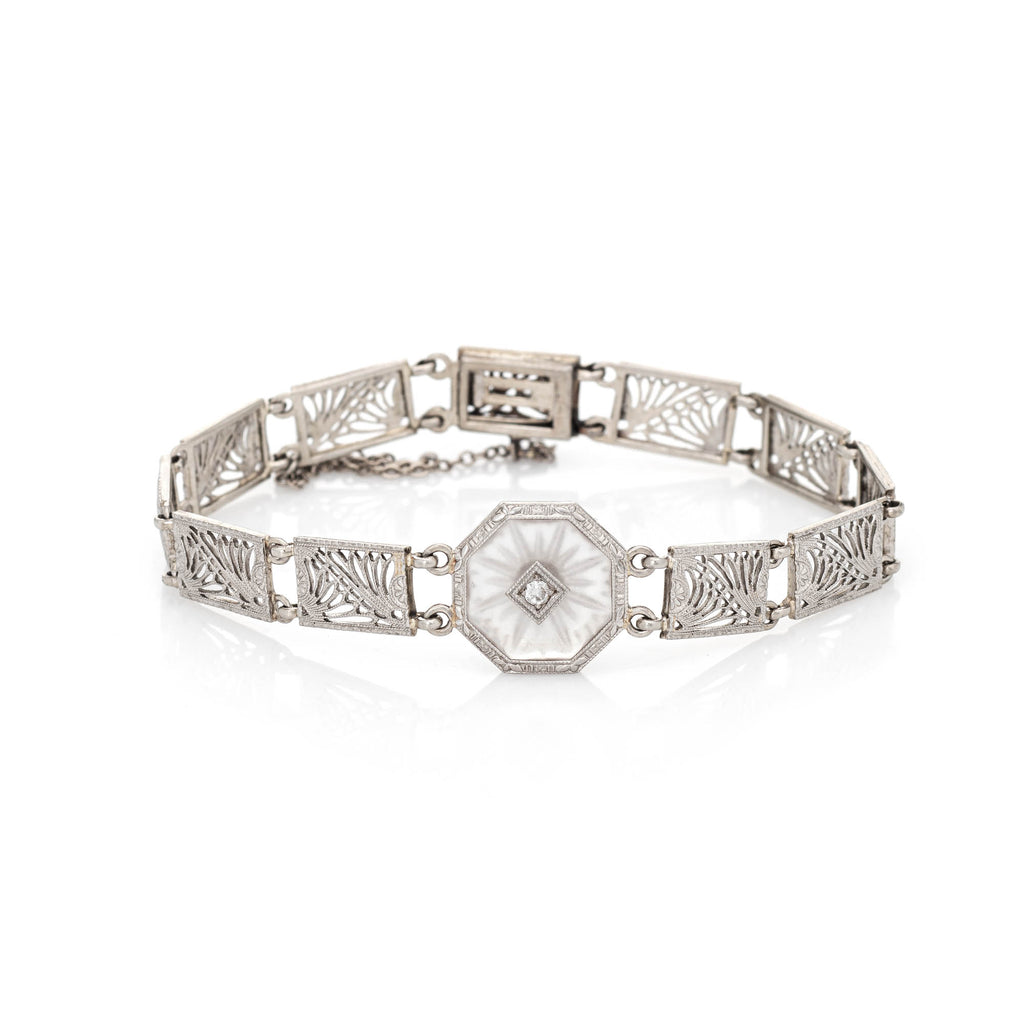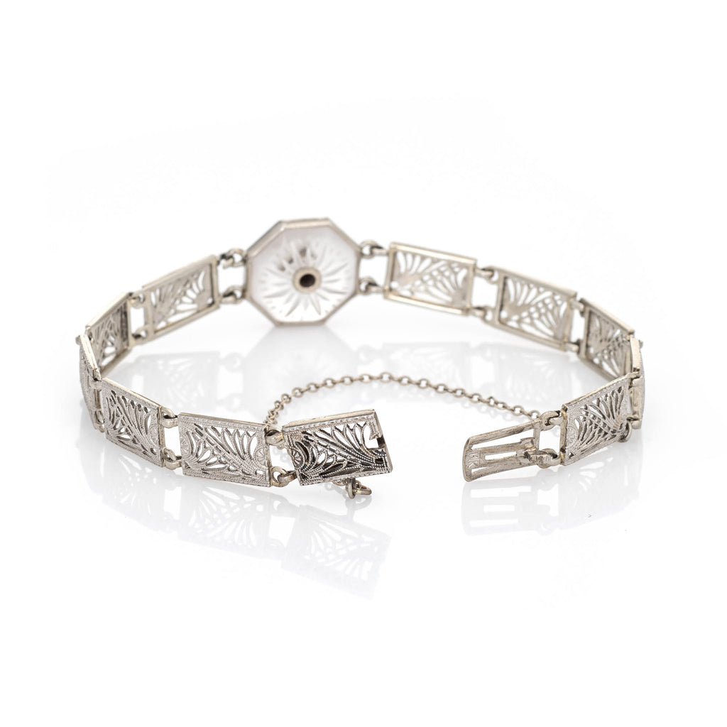 The die-struck bracelet features intricate and lacy filigree detail. The bracelet is comprised of square panels that each measure 10mm x 7mm. The camphor glass is set into a hexagonal mount that measures 13.5mm (0.53 inches). The filigree bracelet was very popular during the era and is a wonderful example of Art Deco era jewelry. It would make an ideal gift to the bride or a special piece of antique jewelry to pass down through the generations.