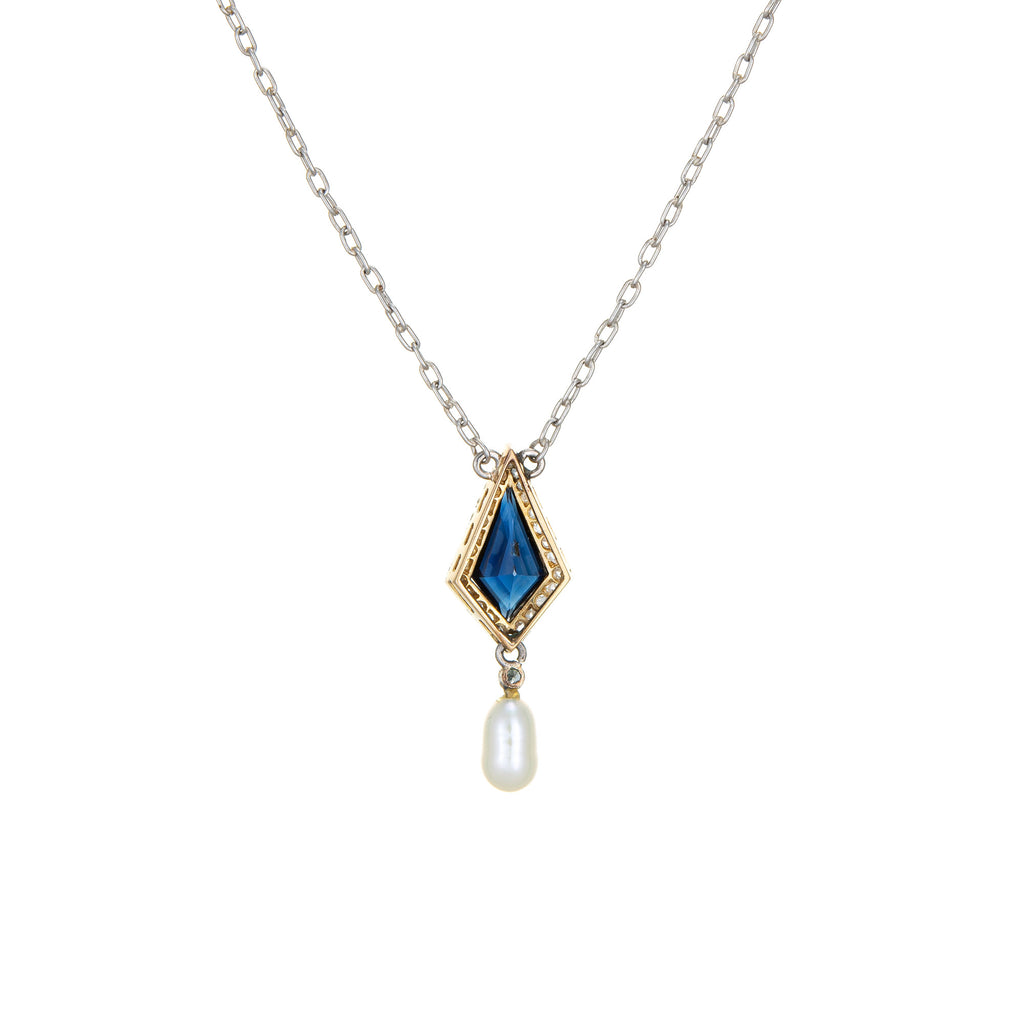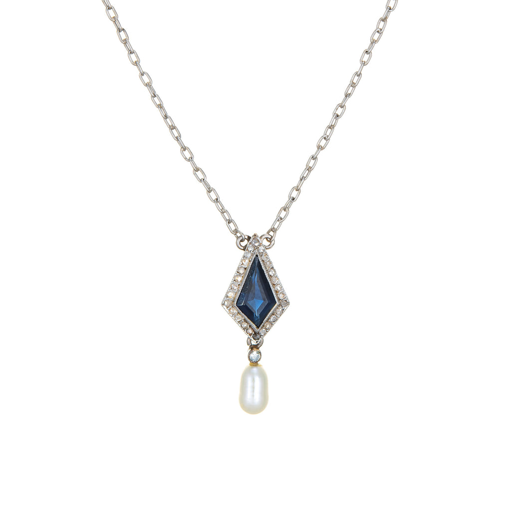 Stones: Rose cut diamonds total an estimated 0.30 carats (estimated at I-J color and I1-2 clarity). One pearl measures 7mm x 4mm. The lab created sapphire measures 10mm x 5mm (in excellent condition and free of cracks or chips).