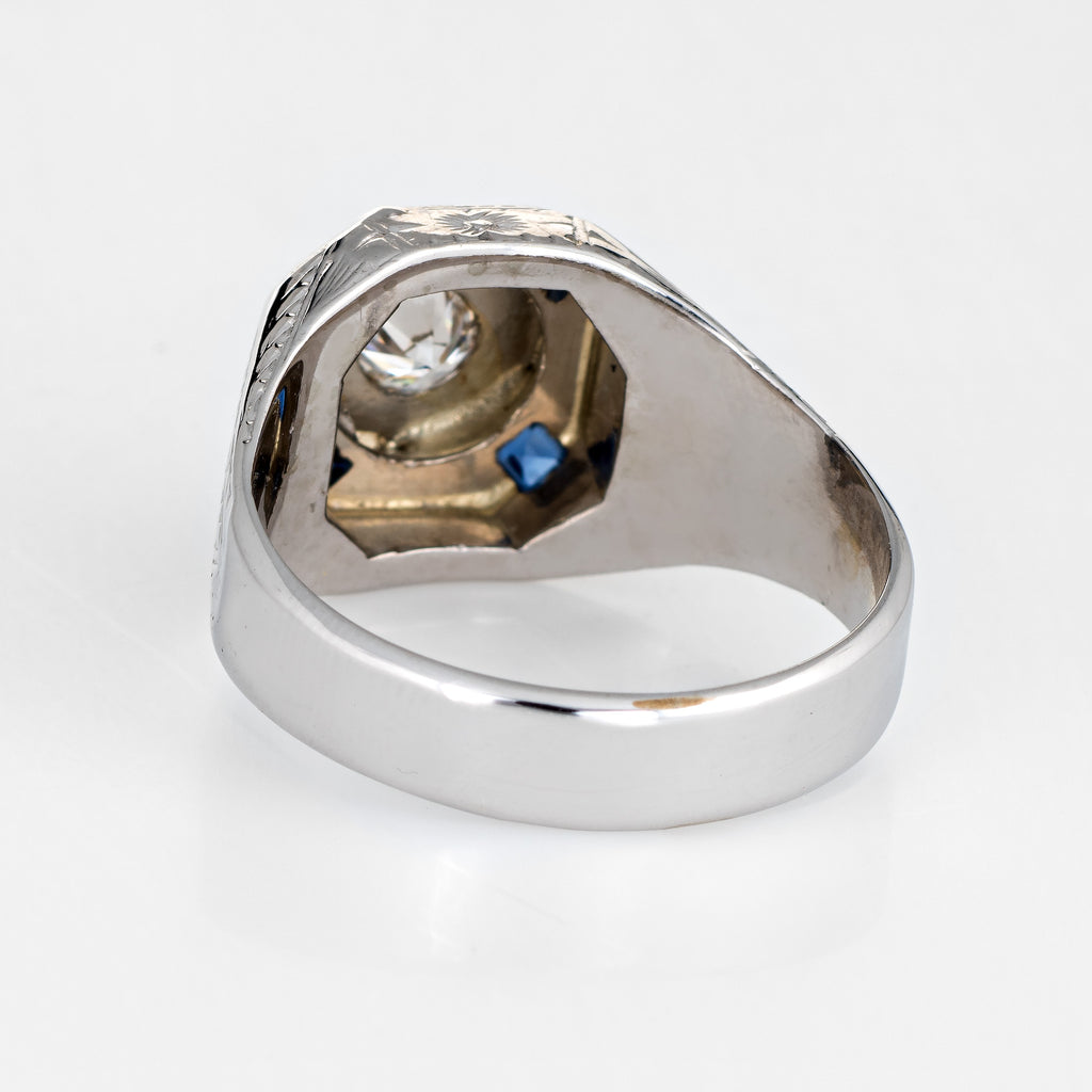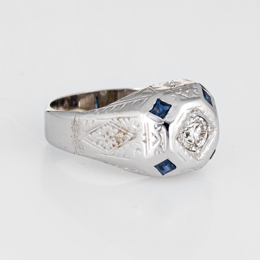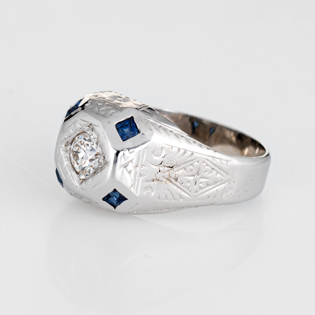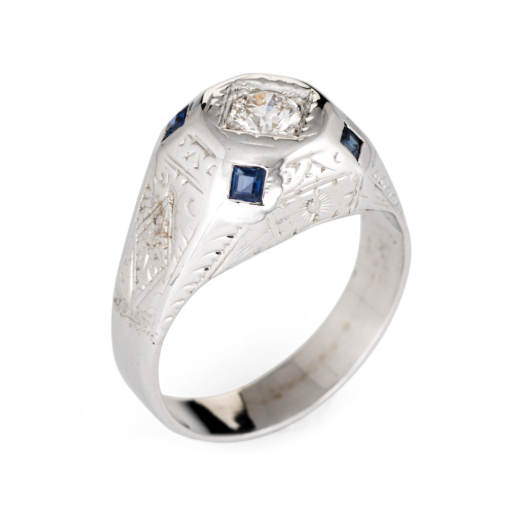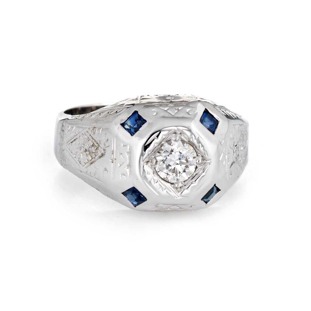 Stones: Centrally mounted estimated 0.35 carat old European cut diamond (estimated at I-J color and SI2 clarity). Four square cut sapphires are estimated at 0.05 carats each (0.20 carats total estimated weight). The sapphires are in excellent condition and free of cracks or chips.