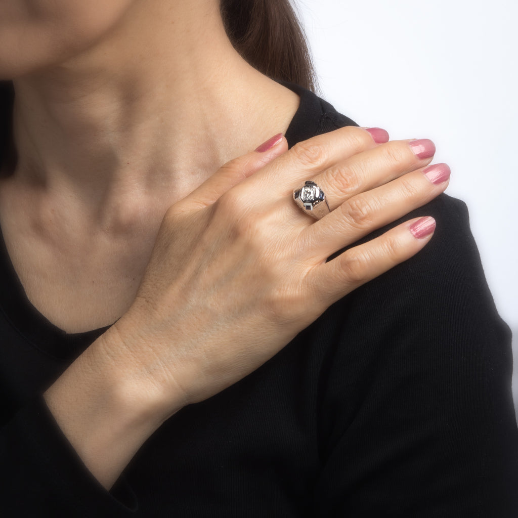 The ring features a triangular design with hand etched detail to the side shoulders, a hallmark of the Art Deco era. The mount has a slightly curved saddle for a comfortable fit on the finger. The ring has a medium profile rising 6mm from the finger (0.23 inches). The ring is suitable for a man or a woman to wear.