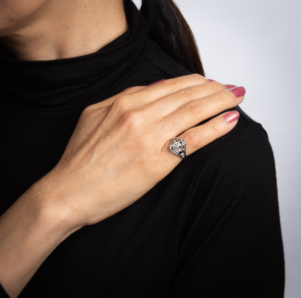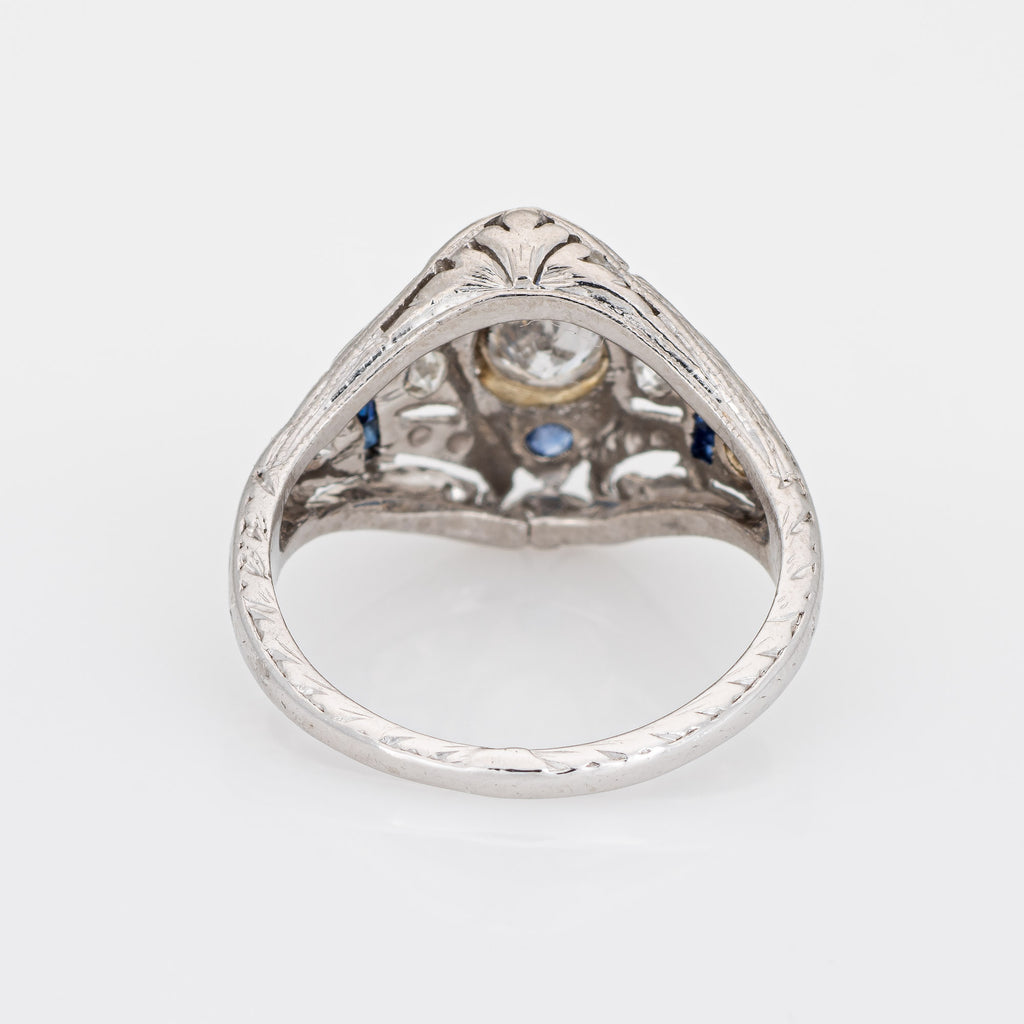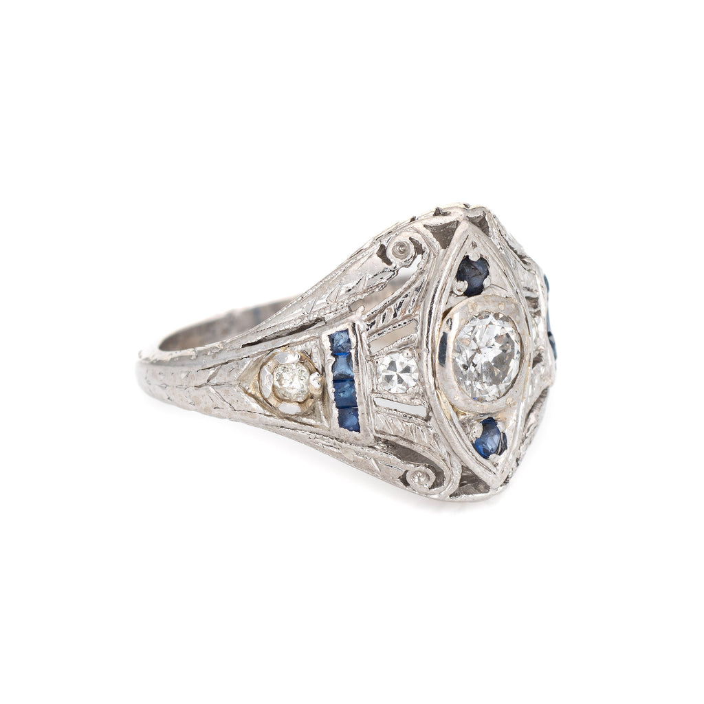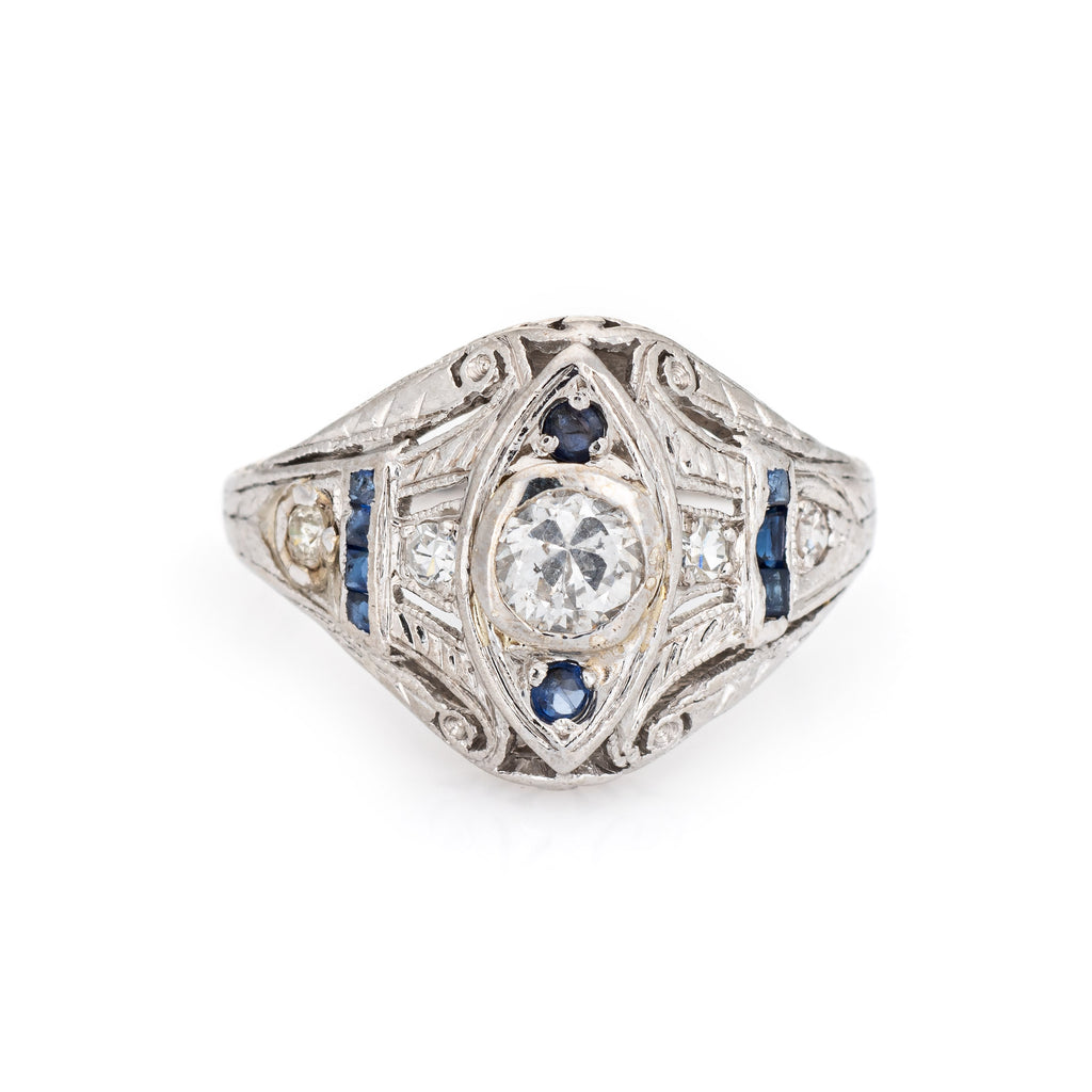 Stones: Centrally mounted estimated 0.20 carat Old European cut diamond is accented with four estimated 0.01 carat single cut diamonds. The total diamond weight is estimated at 0.24 carats (estimated at H-I color and SI2-I1 clarity). French & round cut sapphires adorn the mount and side shoulders and total an estimated 0.10 carats. Note: few chips to the sapphires.