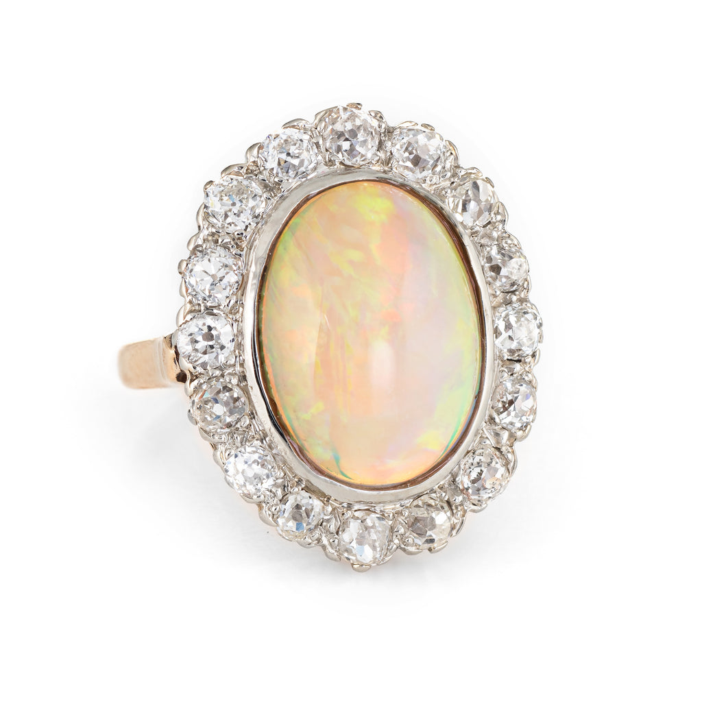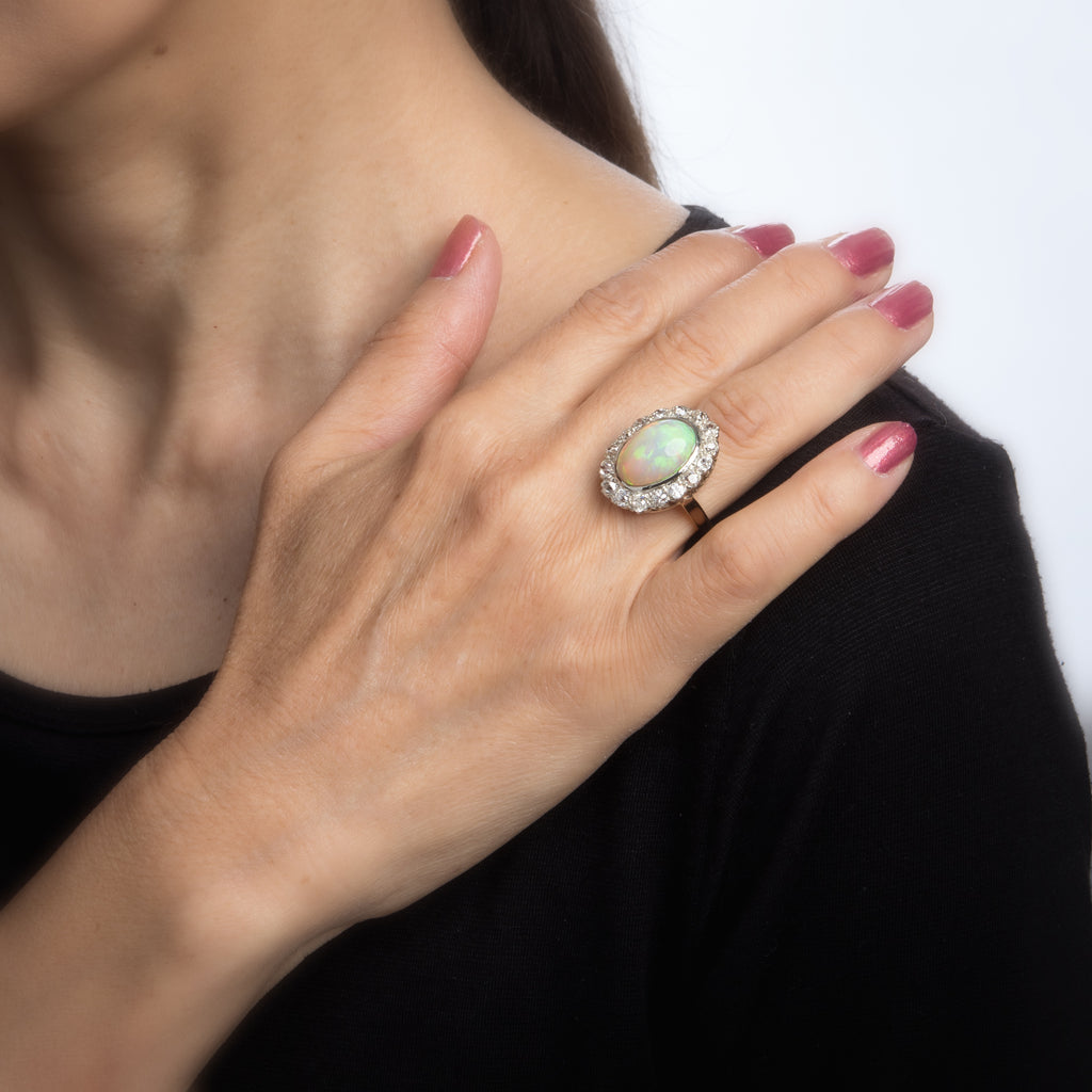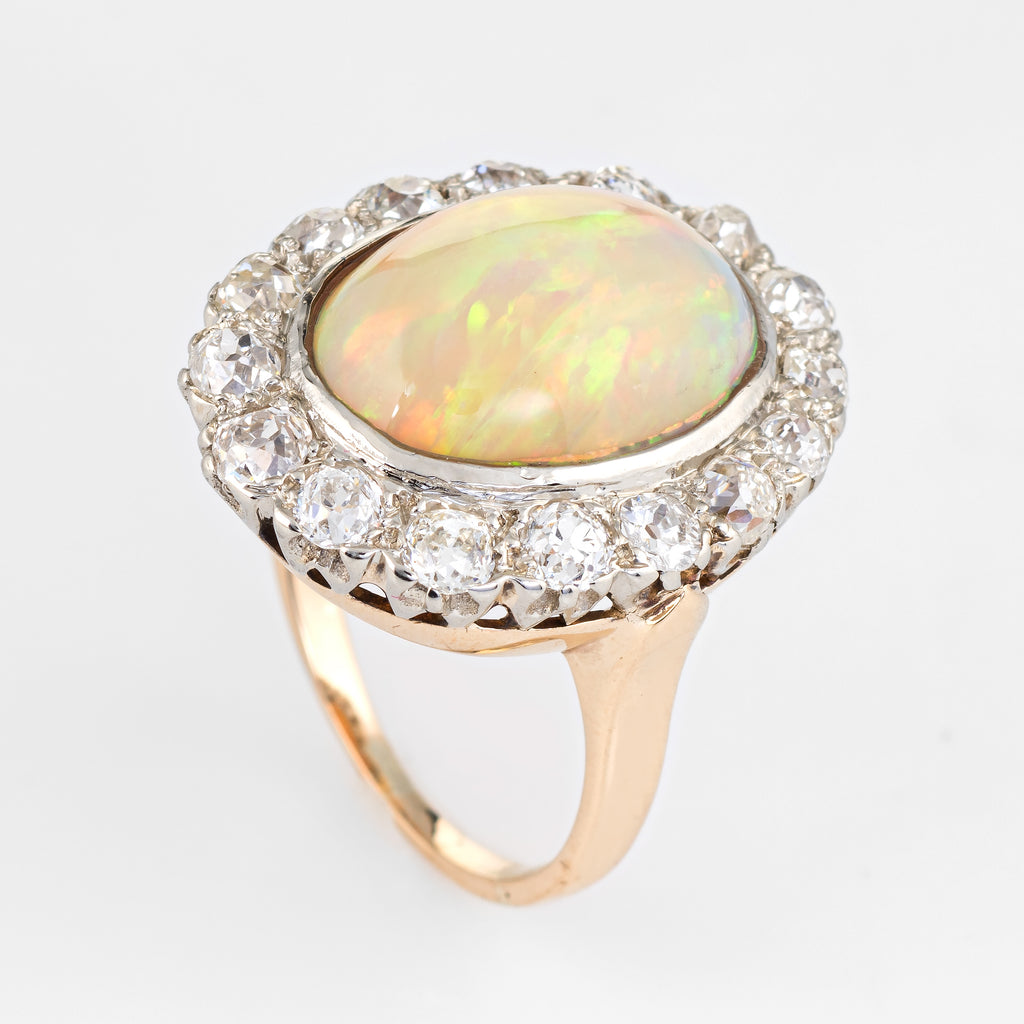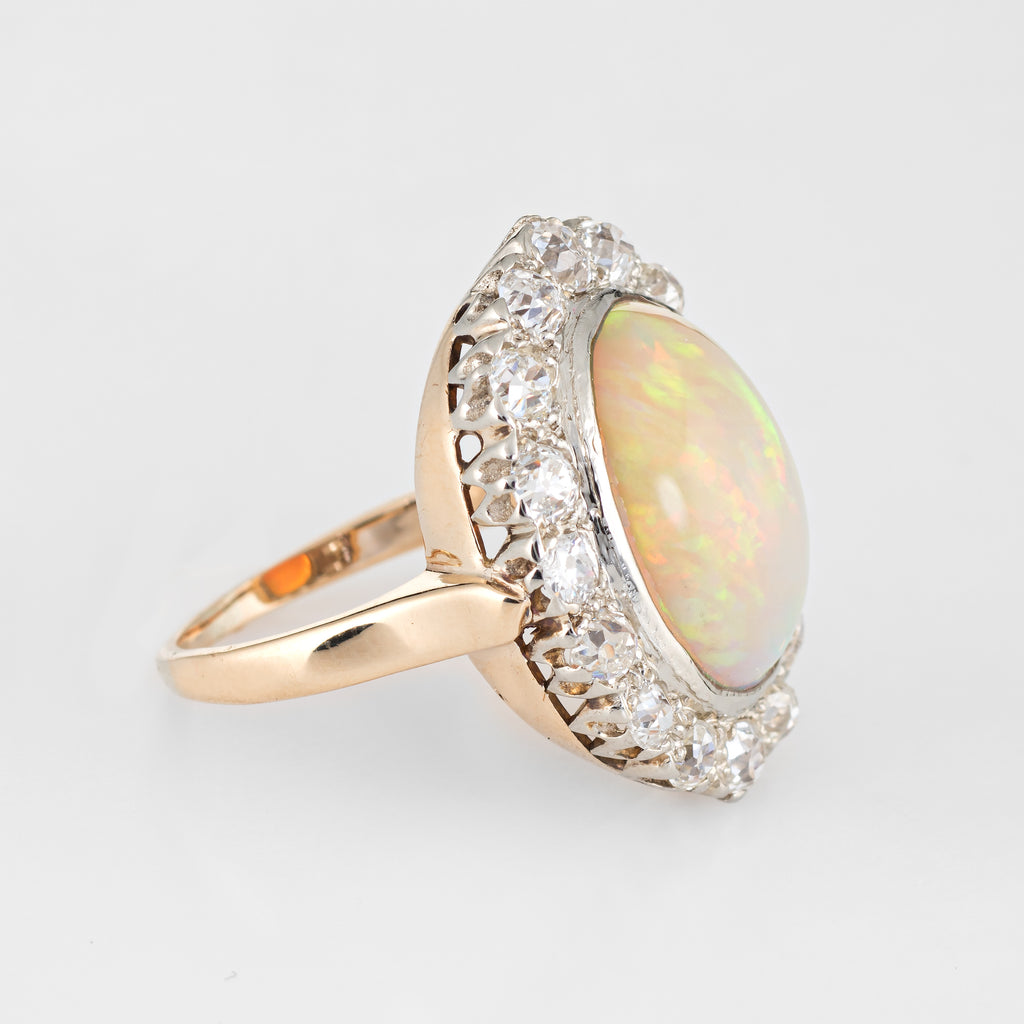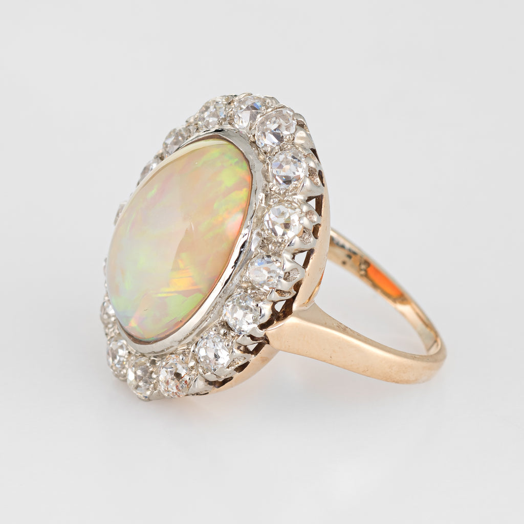Stones: Centrally mounted natural opal measures 14mm x 11mm (estimated at 6 carats), accented with 16 estimated 0.10 carat old mine cut diamonds. The total diamond weight is estimated at 1.60 carats (estimated at I-J color and VS2-SI1 clarity). The Ethiopian opal is a later addition to the ring. It is in excellent condition and free of cracks or chips.