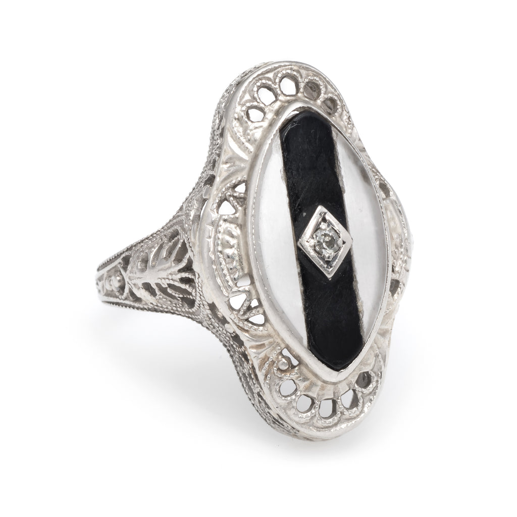 Onyx and rock crystal are inlaid into the mount measuring 15mm x 7mm, accented with an estimated 0.01 carat single cut diamond (estimated at J color and VS2 clarity). Note: few chips to the inlaid mount (visible under a 10x loupe).