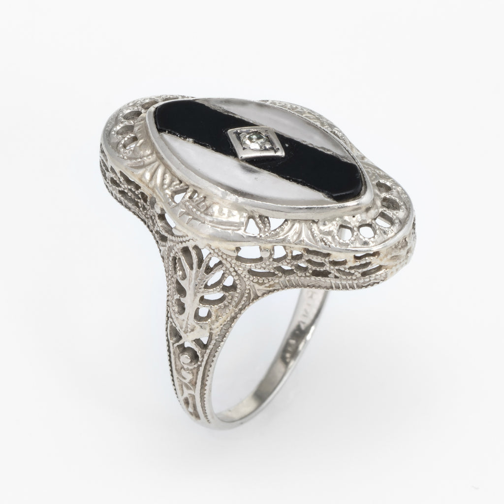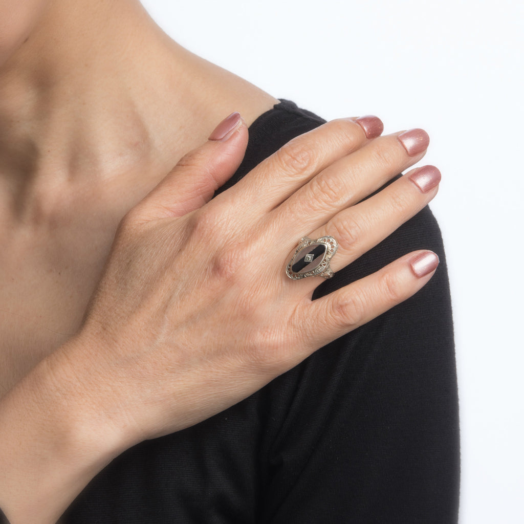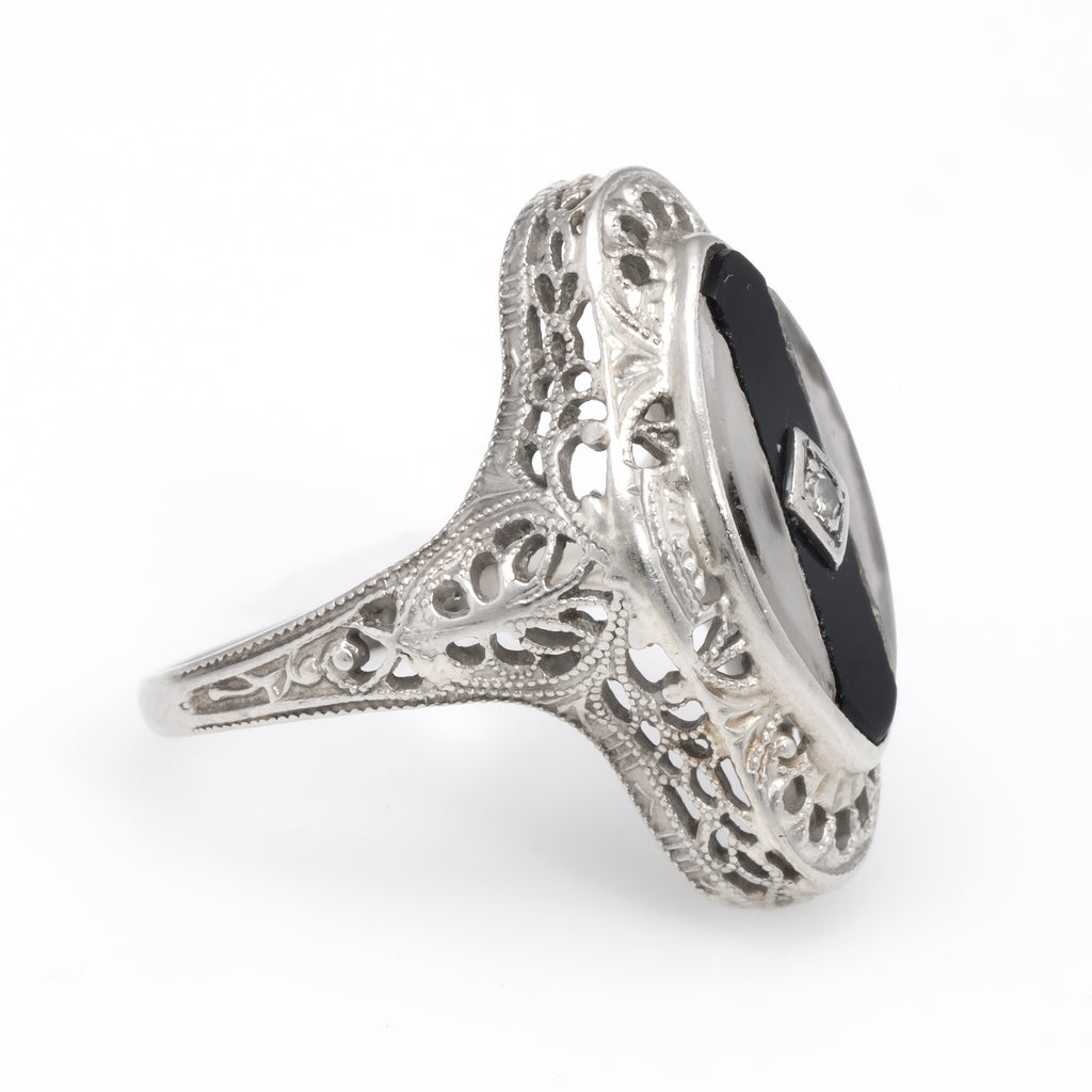 Stones: Onyx and rock crystal are inlaid into the mount measuring 15mm x 7mm, accented with an estimated 0.01 carat single cut diamond (estimated at J color and VS2 clarity). Note: few chips to the inlaid mount (visible under a 10x loupe).