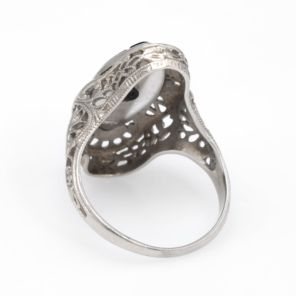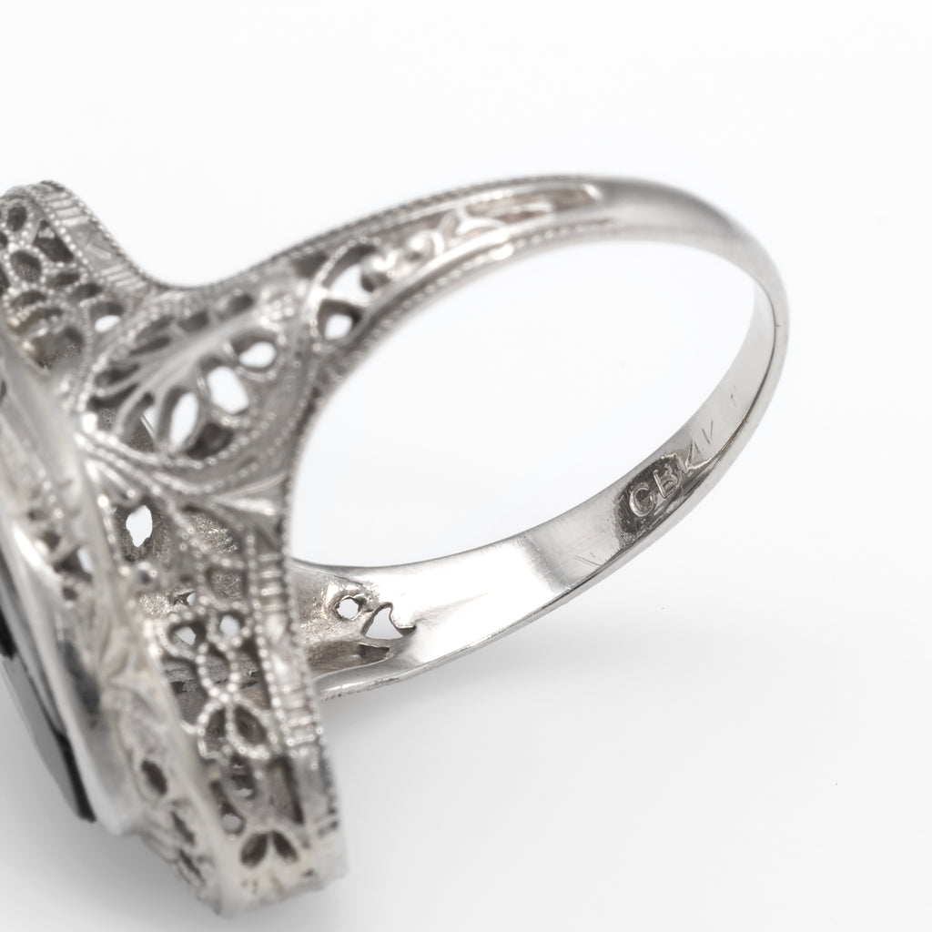 Finely detailed Art Deco era ring (circa 1920s to 1930s), crafted in 14 karat white gold.