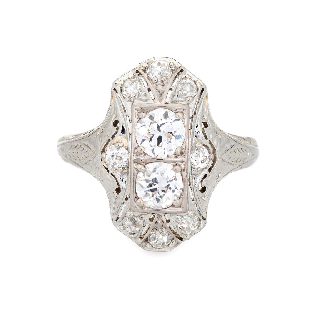 Stones: Two centrally mounted old European cut diamonds are estimated at 0.48 carats each. A further 8 old mine cut diamonds total an estimated 0.42 carats. The total diamond weight is estimated at 1.38 carats (I-J color and VS2-I2 clarity).