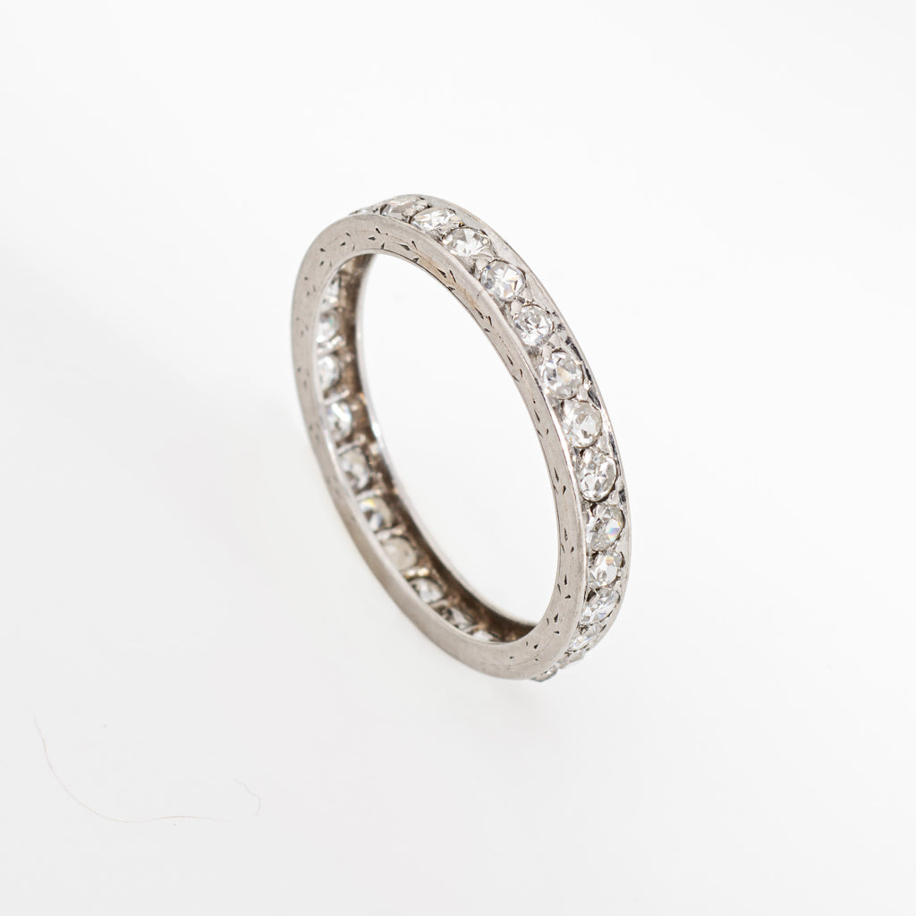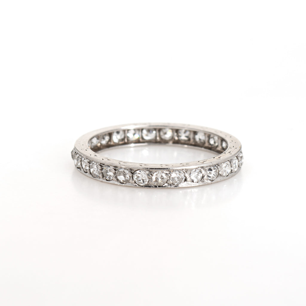 The ring epitomizes vintage charm and would make a lovely alternative wedding band. The band features a scrolled etched pattern on both outer edges of the ring, though due to wear the pattern has worn down. Great worn alone or stacked with your jewelry from any era.