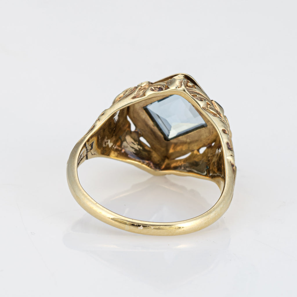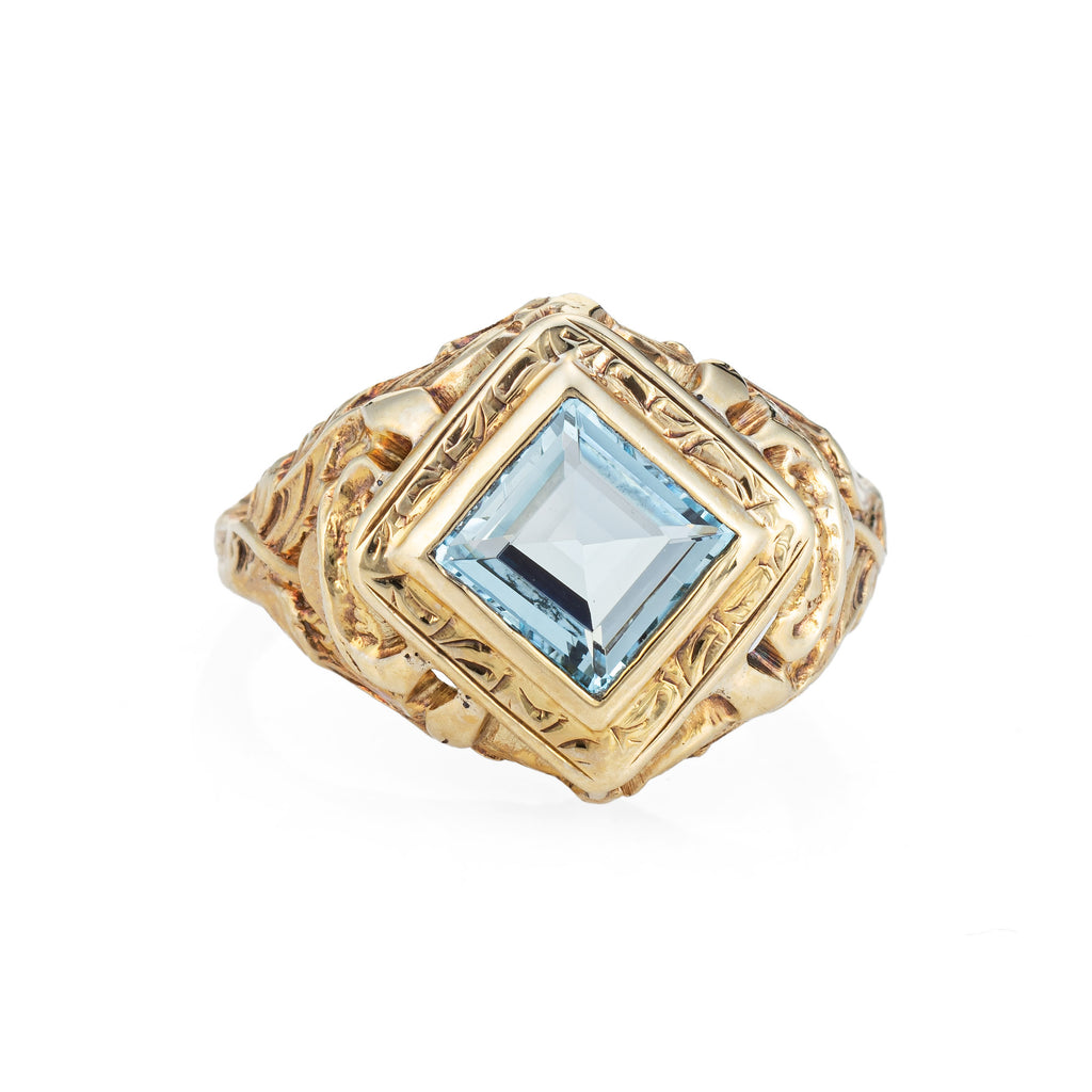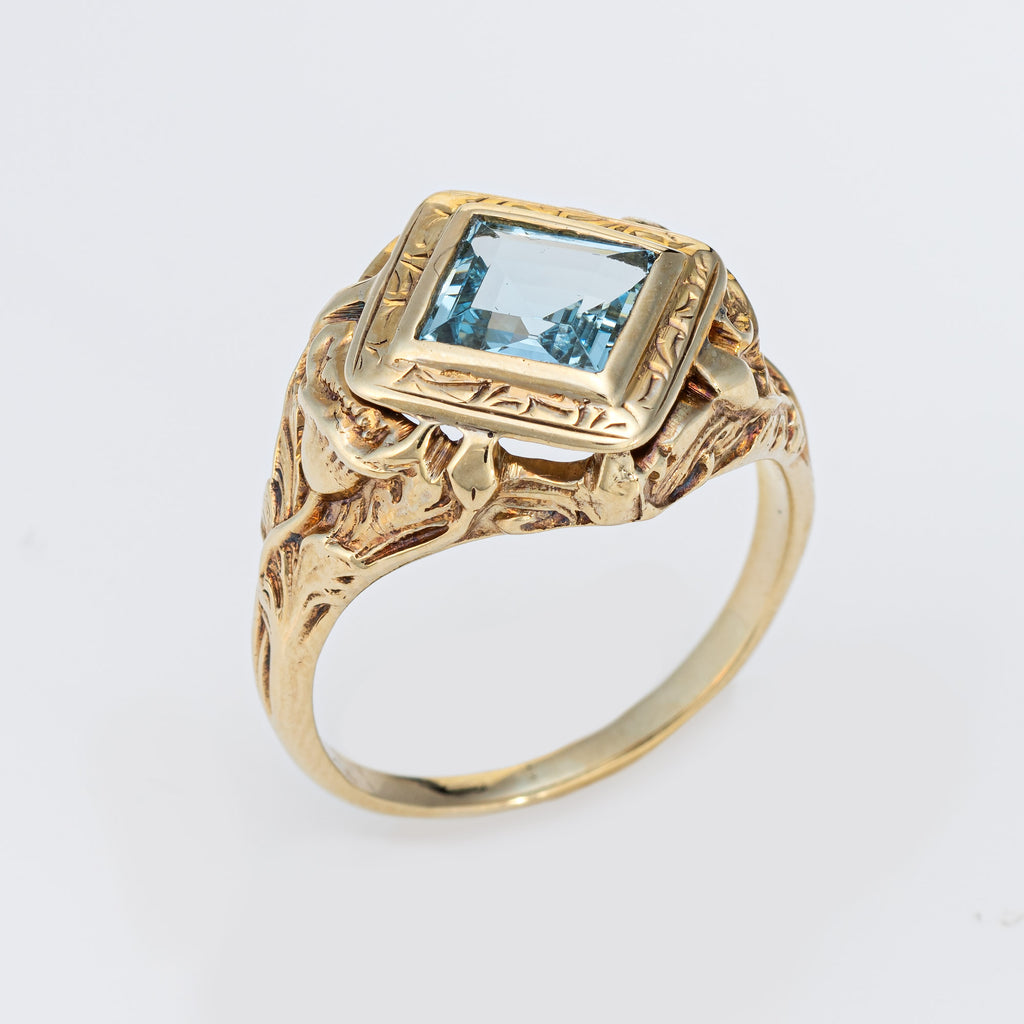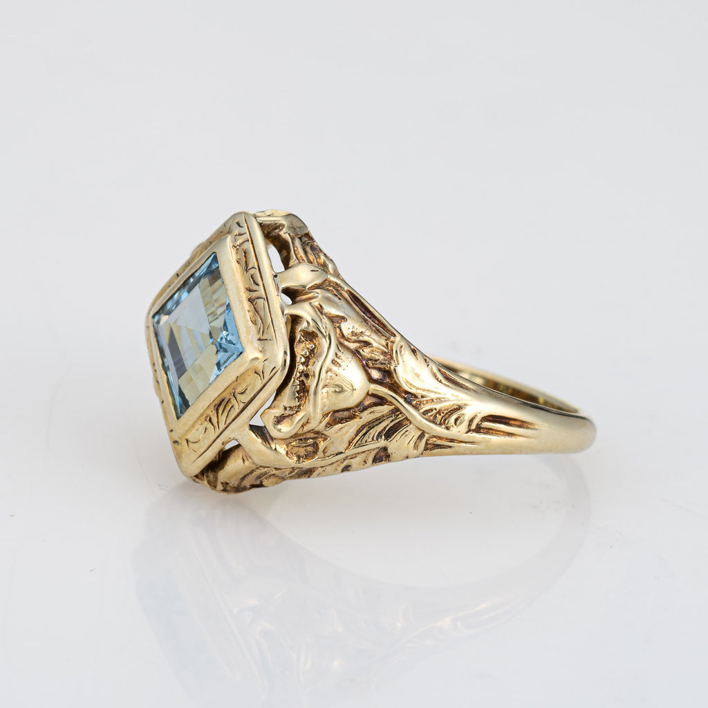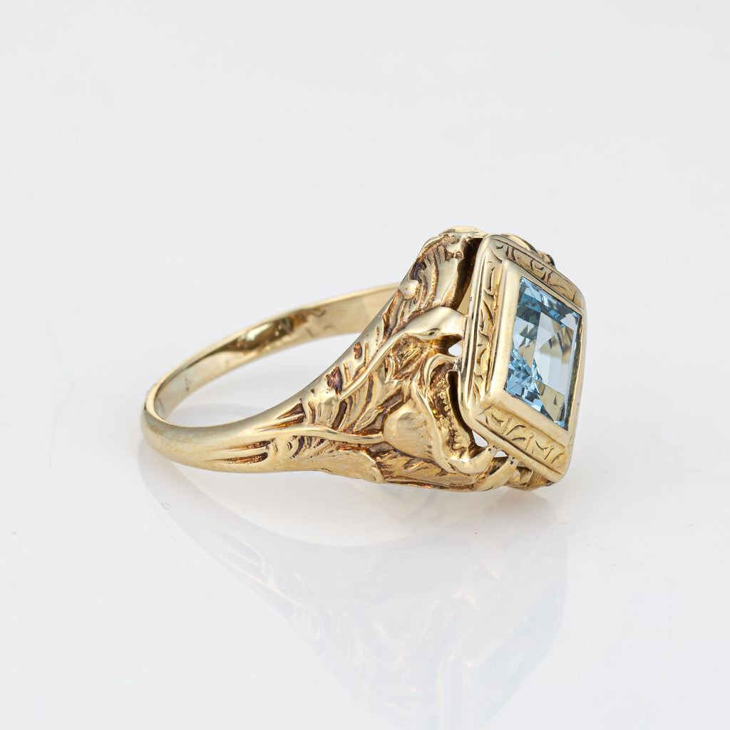 Stylish and finely detailed Art Nouveau aquamarine ring crafted in 10 karat yellow gold (circa 1910s).