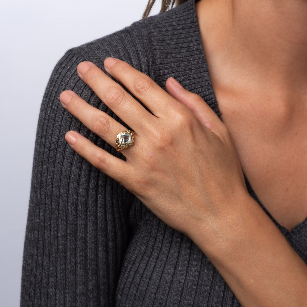 The beautiful aquamarine is set flush into the mount and is perched upon a floral gallery. The ring is great for day or evening wear. The low rise ring (5mm - 0.19 inches) sits comfortably on the finger.