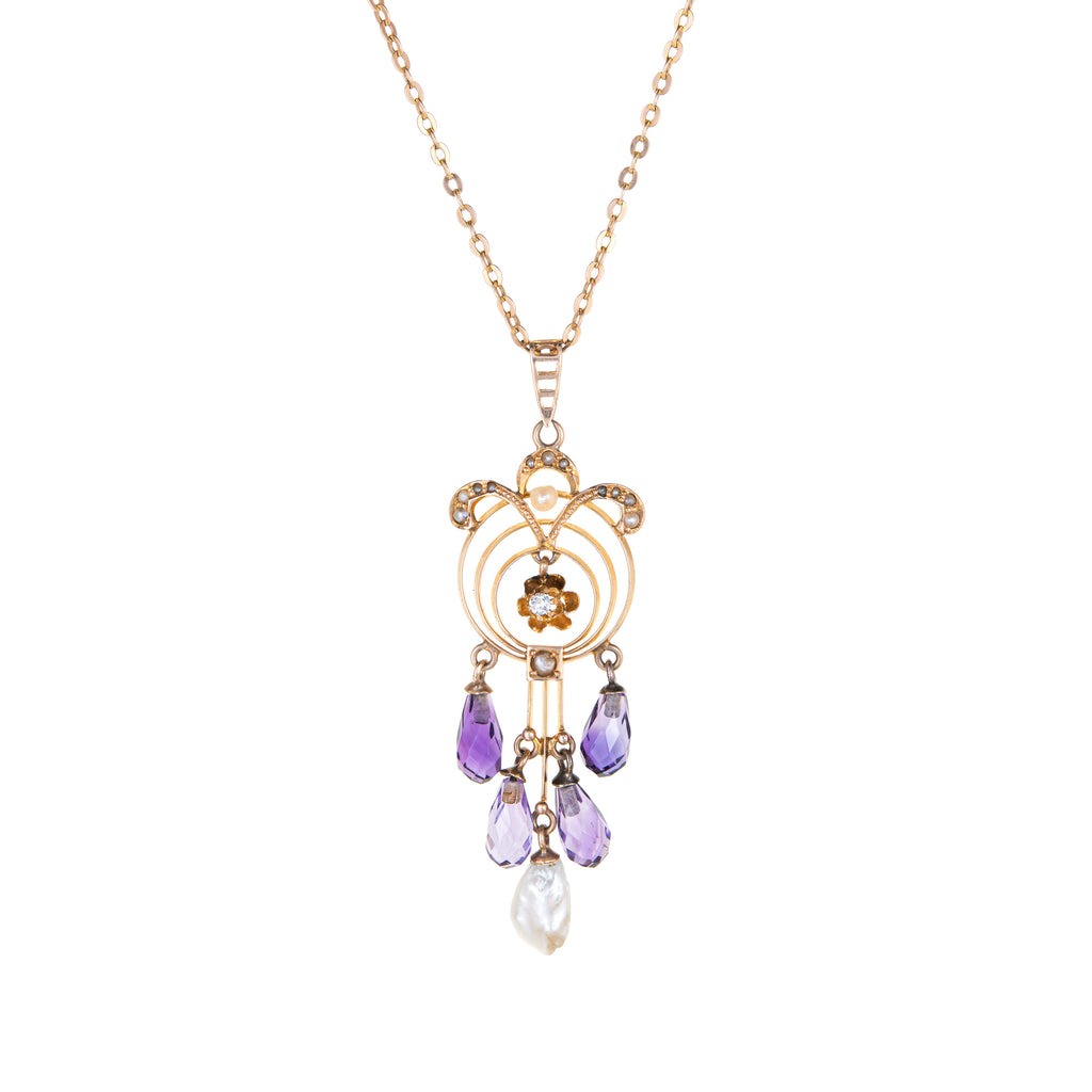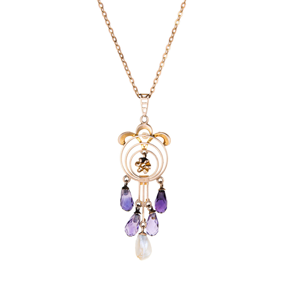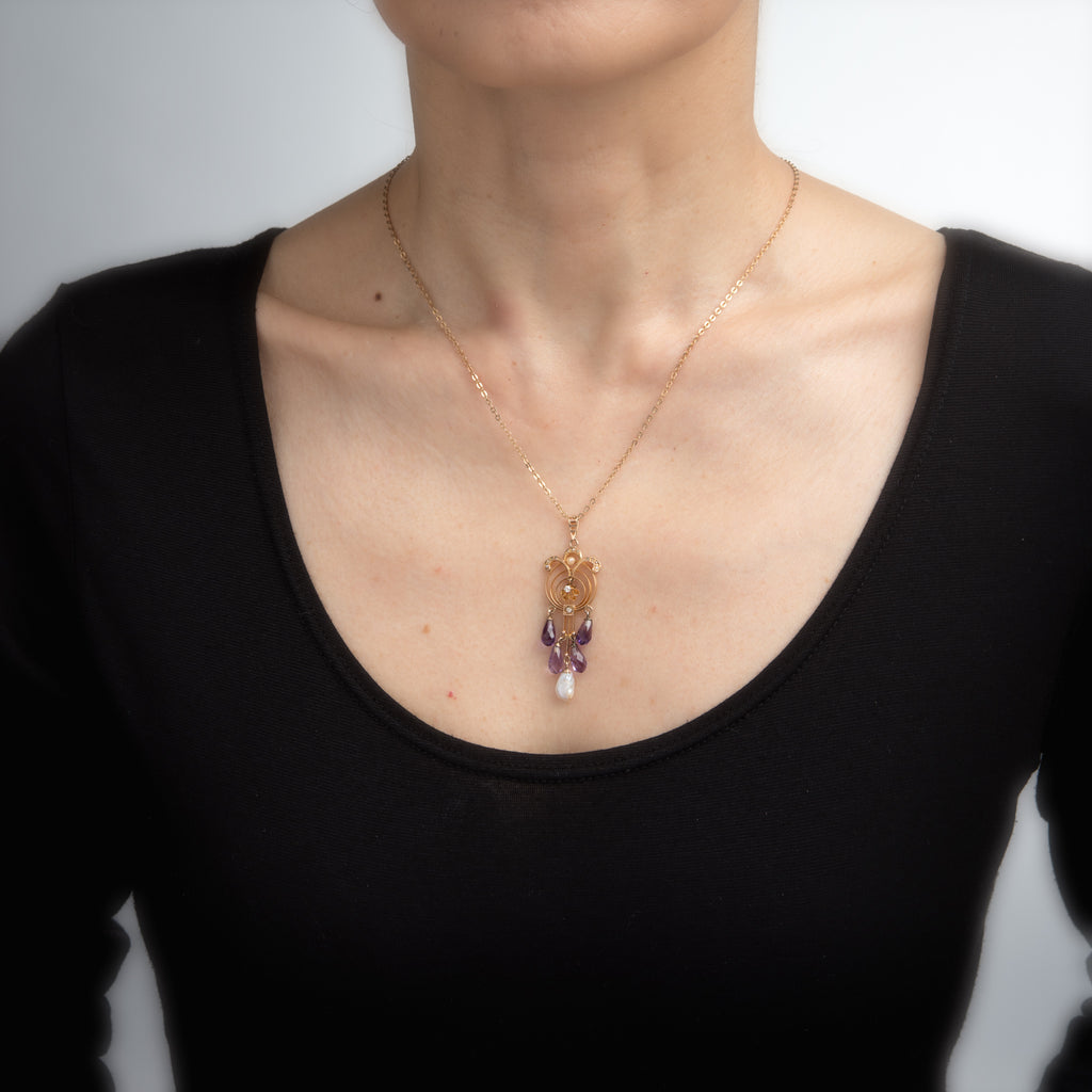 The necklace measures 17 inches in length and sits nicely just below the nape of the neck. The circular design is finished with scrolled detail to the top and a fringe of amethyst briolette's and a natural pearl at the base. An attractive piece to wear alone or layered with your other fine necklaces.