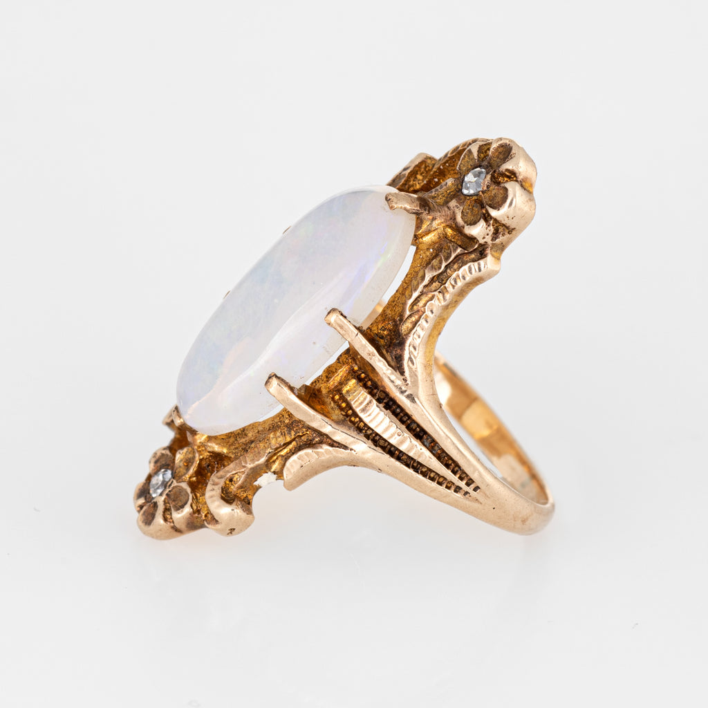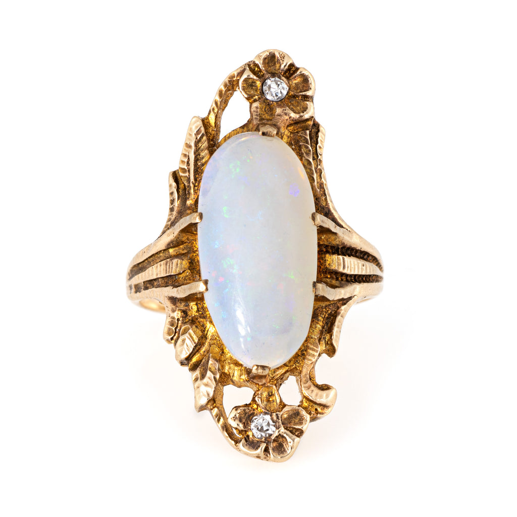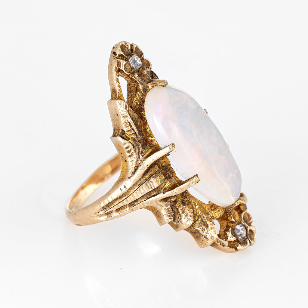 Finely detailed antique Art Nouveau era opal & diamond ring (circa 1900s to 1910s) crafted in 10 karat yellow gold.
