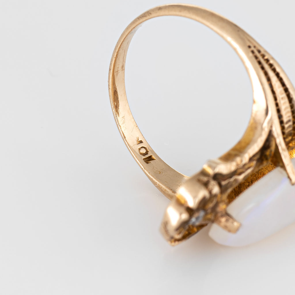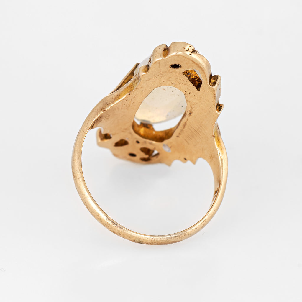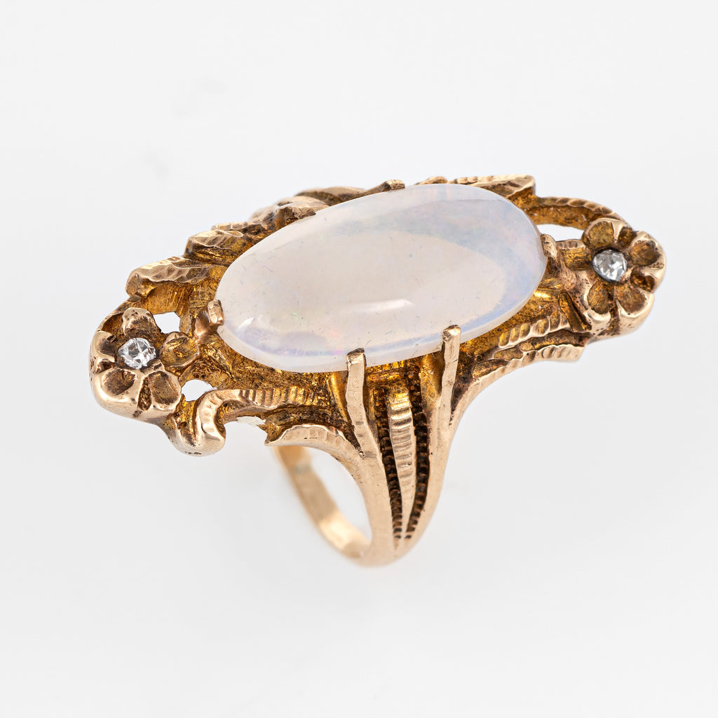 Finely detailed antique Art Nouveau era opal & diamond ring (circa 1900s to 1910s) crafted in 10 karat yellow gold.