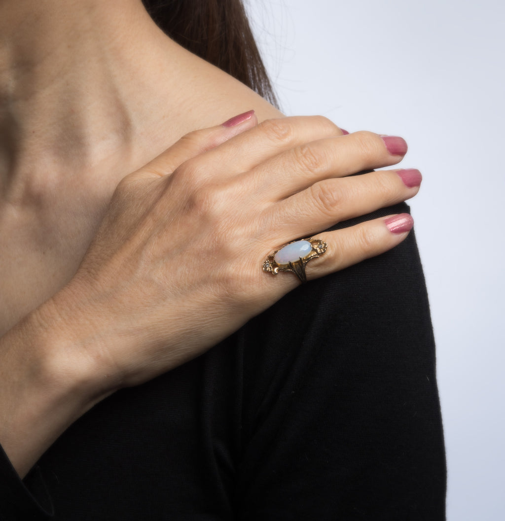 Stones: Cabochon cut opal measures 16mm x 7.5mm (estimated at 3.50 carats), accented with two estimated 0.01 carat old single cut diamonds. The opal is in excellent condition and free of cracks or chips.