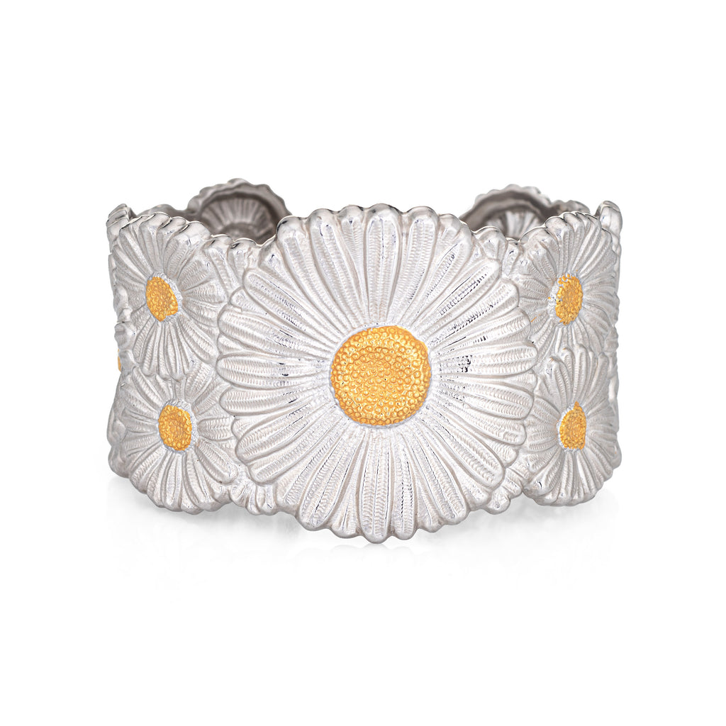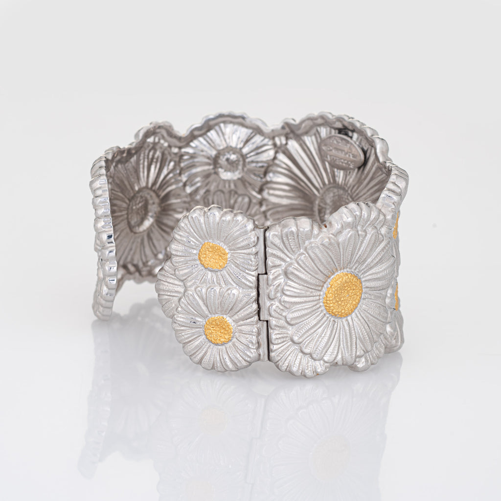 The elaborate cuff features daisy flowers with yellow gold plated centers. The Italian jewelry house, Buccellati, is famed for its intricately designed jewelry since the mid 18th century. The cuff bracelet is wide (36.5mm - 1.43 inches) and makes a great statement on the wrist. The bracelet is designed to fit a small wrist (6 1/4inches) so we encourage you to measure your wrist size prior to purchase. The cuff features a hinged opening to allow the bracelet to easily slip on and off the wrist.