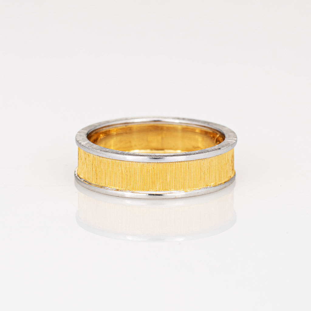 The band features hand engraved textured gold detail to the yellow gold portion of the band, a distinct hallmark of Buccellati jewelry, with white gold detail framing the band. The ring is great for wear alone or layered with your fine jewelry from any era.