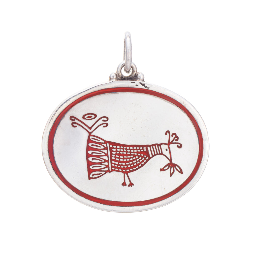 The medallion features a stylized bird in red enamel, framed with a red border. The medium sized oval medallion makes a statement and is ideal worn alone as a standout piece or layered.