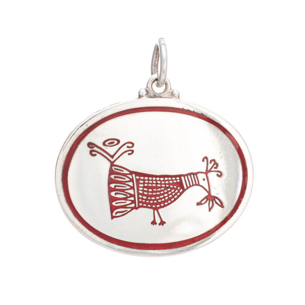 The medallion features a stylized bird in red enamel, framed with a red border. The medium sized oval medallion makes a statement and is ideal worn alone as a standout piece or layered.