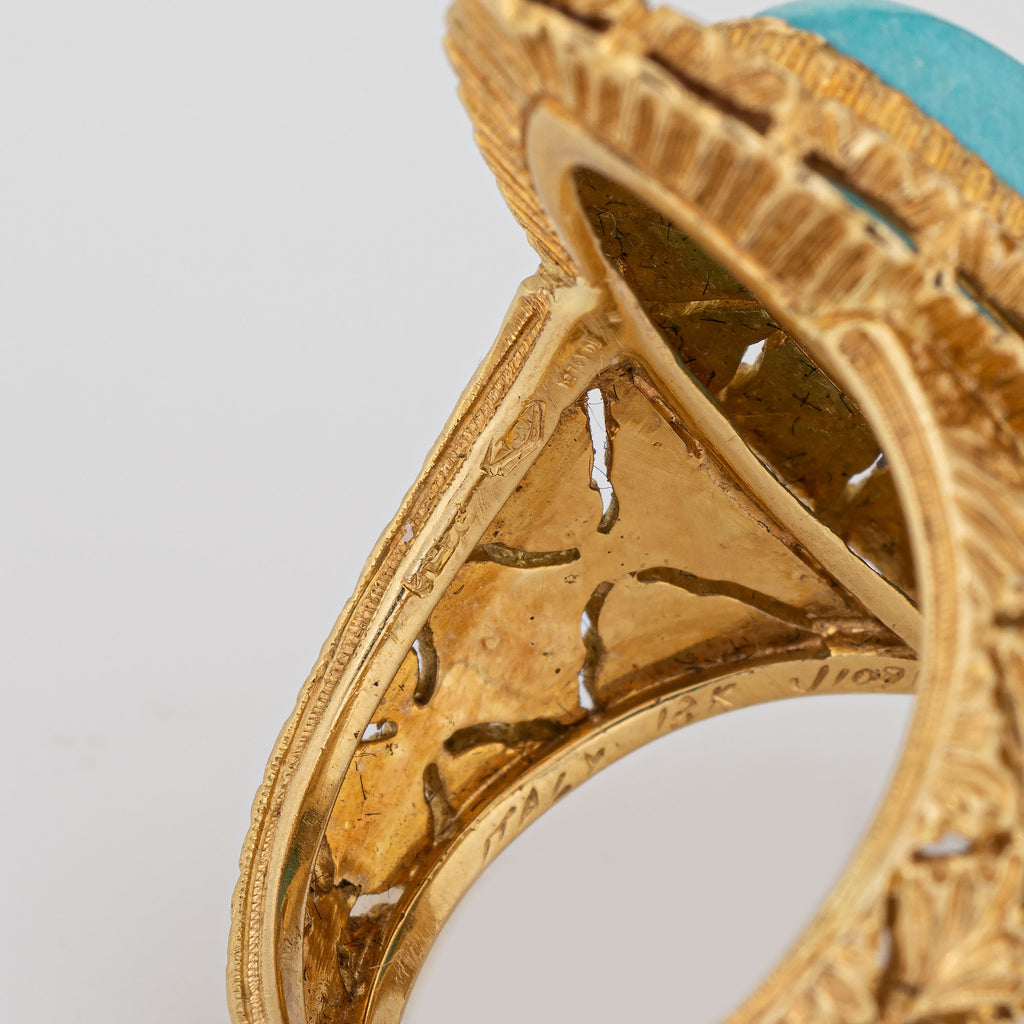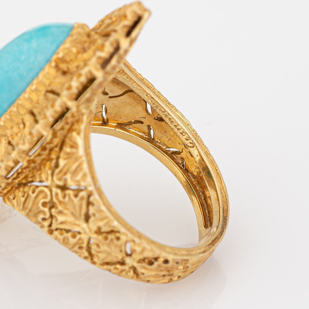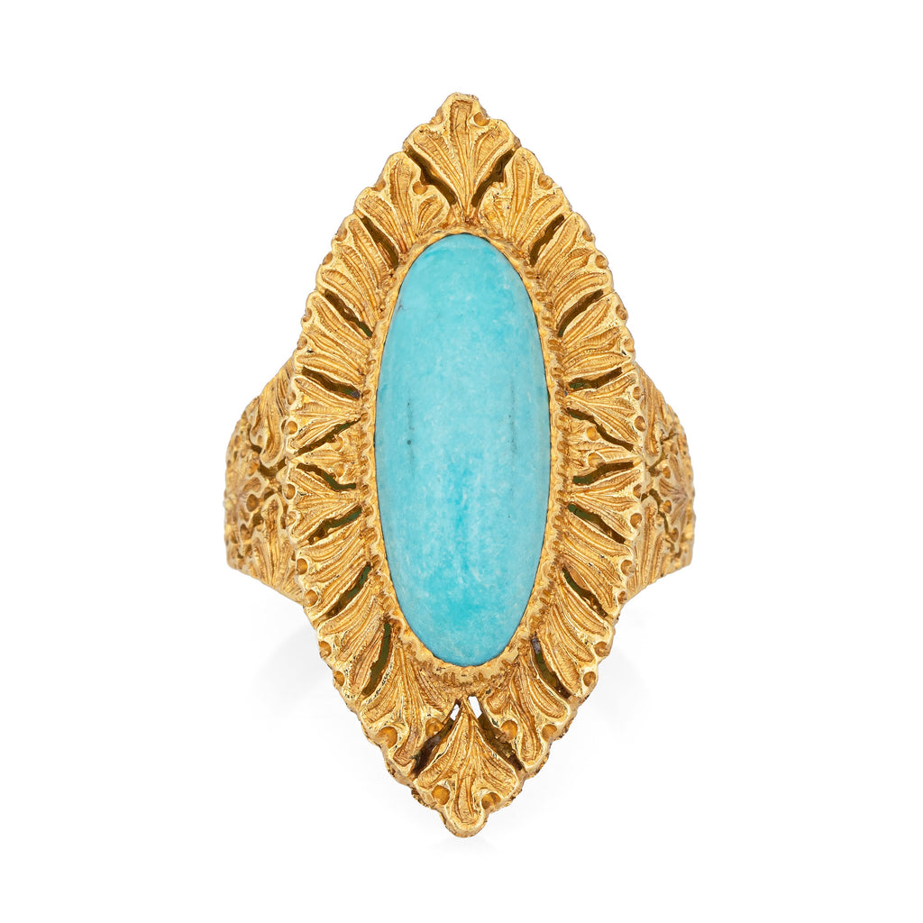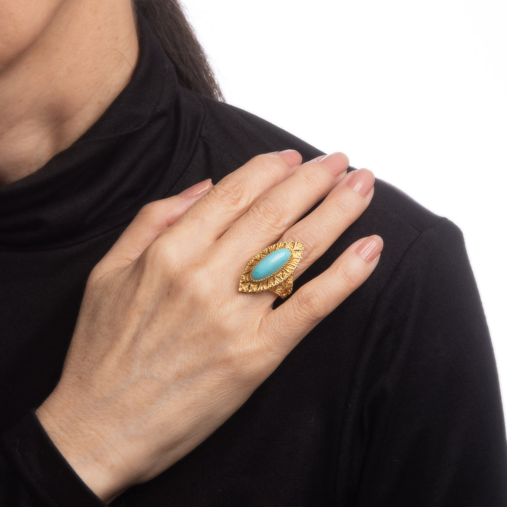 Designed by the famed Gianmaria Buccellati, the navette style ring is set with egg shell blue turquoise. The ring features hand engraved textured gold detail, a distinct hallmark of Buccellati jewelry. The cocktail ring makes a nice statement on the hand. The medium rise ring (9mm - 0.35 inches) sits comfortably on the finger.
