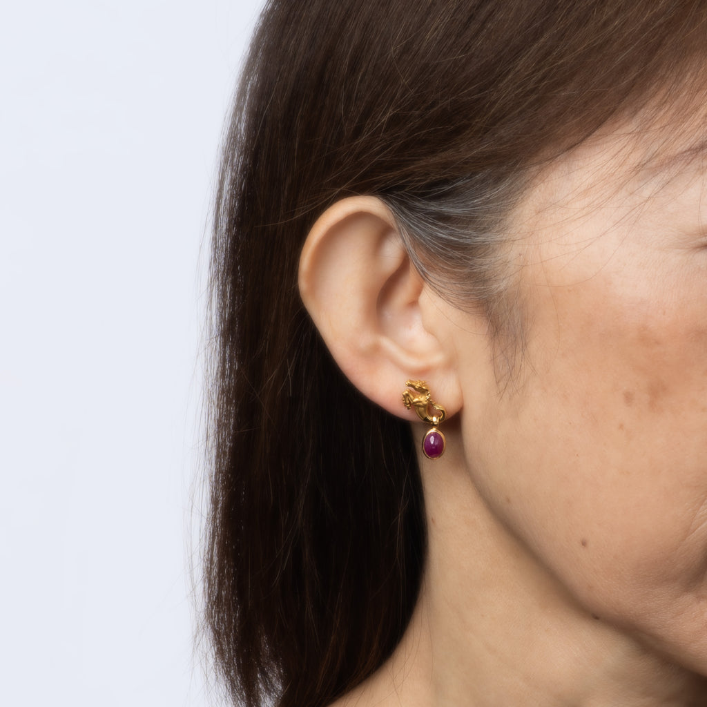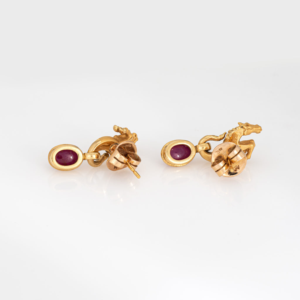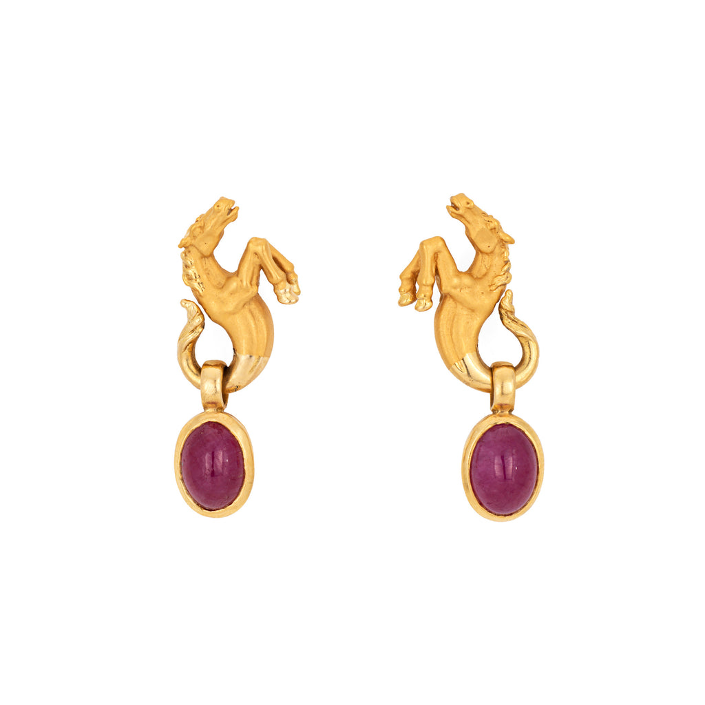 Carrera y Carrera is a Spanish jewelry brand known for exquisite craftsmanship. Carrera y Carrera's most iconic motifs include animals with the graceful and powerful panther a testament to the brands artistry. Each Carrera y Carrera piece is meticulously handcrafted by skilled artisans with the utmost precision and attention to detail. The horse earrings are no exception. Cabochon cut rich red rubies adorn the base, adding a vibrant rich color to the bright buttery 18k gold mounts.