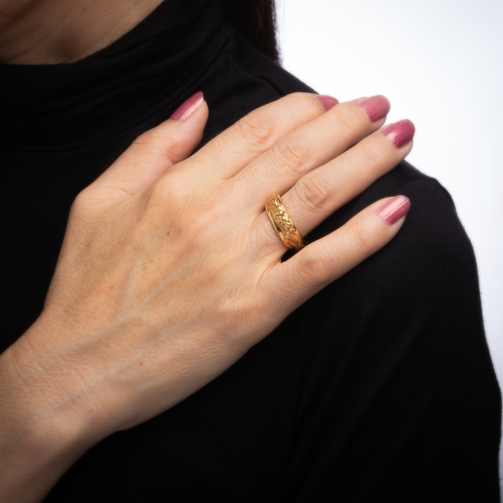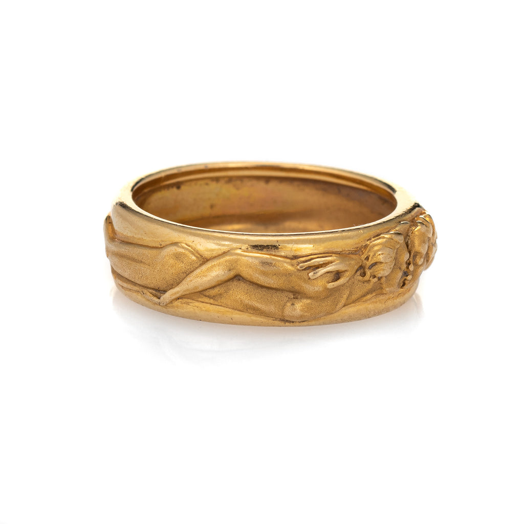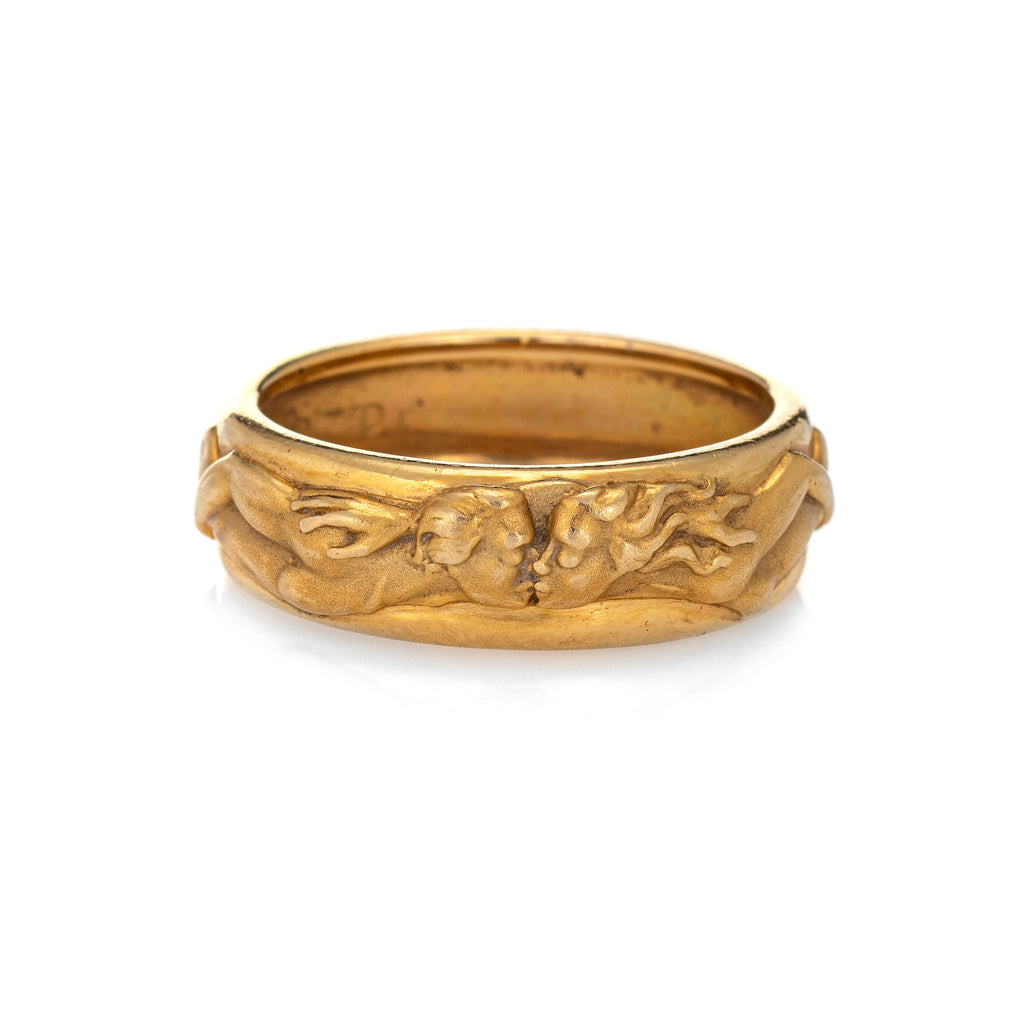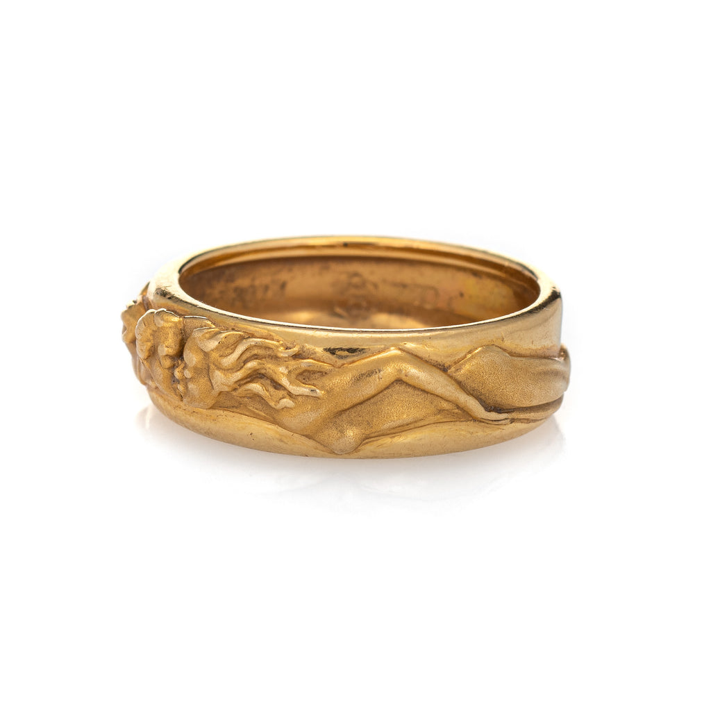 The beautifully detailed ring features a man and woman enveloped around the band in matte gold, coming together to kiss. The ring is from the 'Promesa' collection, circa 2014. The low rose band (3mm - 0.11 inches) sits comfortably on the finger. The ring is impactful in design and ideal worn day or night.