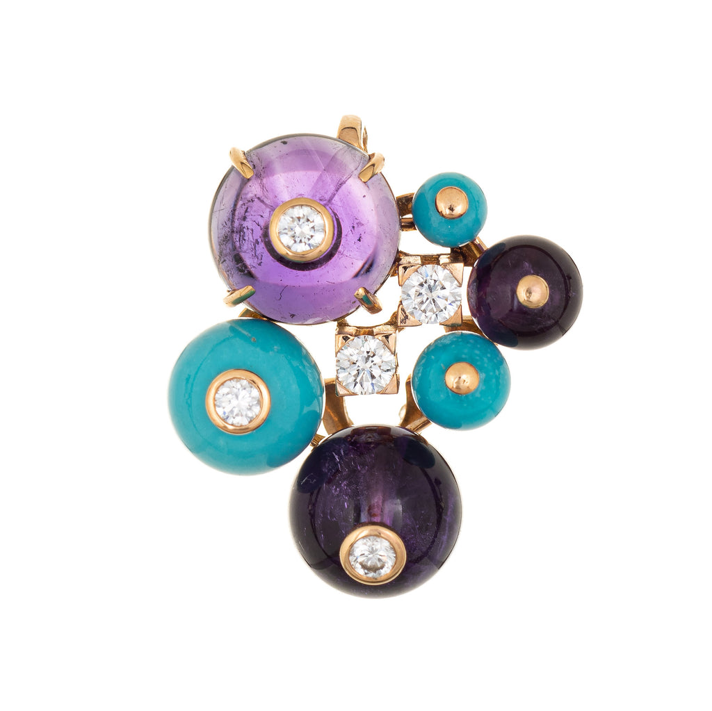 Stones: The pendant is set with amethyst and turquoise in various sizes ranging from 5mm to 10mm. Five diamonds total an estimated 0.45 carats (estimated at E-F color and VVS2 clarity). The gemstones are in very good condition and free of cracks or chips.