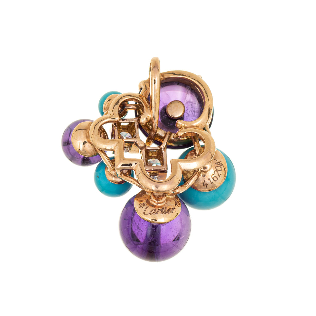Stylish pre-owned Cartier 'Les Delices De Goa' turquoise & amethyst pendant crafted in 18k yellow gold.