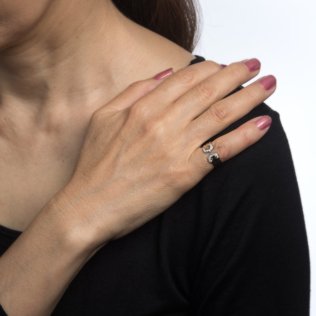 The classic Double C ring features three bands of gold seamlessly joined together terminating to the diamond set Double C's. The ring is small (size 3 1/4) and ideal for wear on the pinky finger. The ring was recently professionally cleaned and polished. It is no longer available for sale at retail and considered a collector piece.