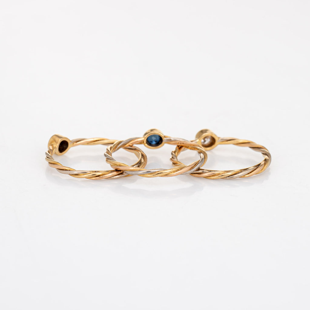 Two of the bands are set with sapphires (estimated at 0.05 carats each - 0.10 carats total estimated weight). One diamond is estimated at 0.05 carats (estimated at F-G color and VVS2 clarity). The set of three bands features the intertwined Trinity design of white, rose and yellow gold with the gemstones set into round bezel mounts. The rings are petite in scale and can be worn together as a stacking set or individually.