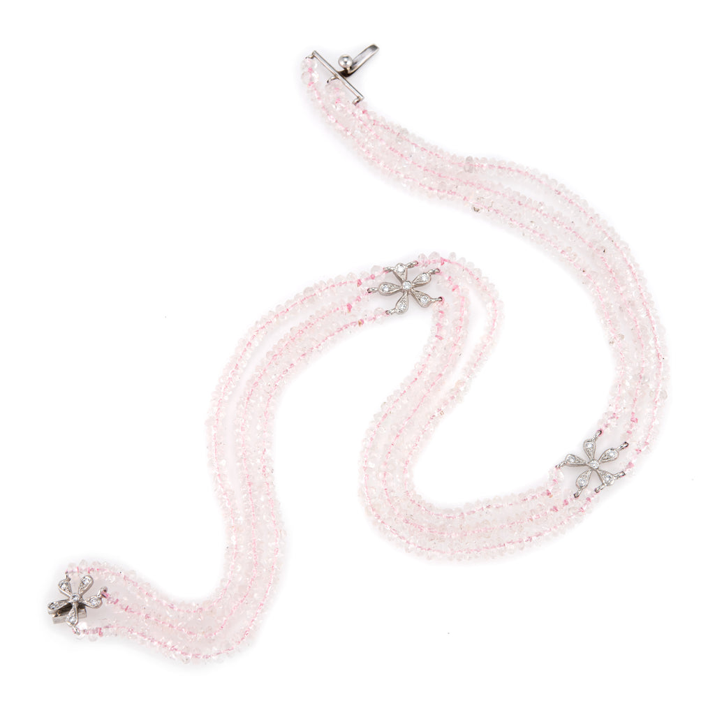 Finely detailed pre owned Cathy Waterman 3 strand rose quartz & diamond choker necklace crafted in 900 platinum.