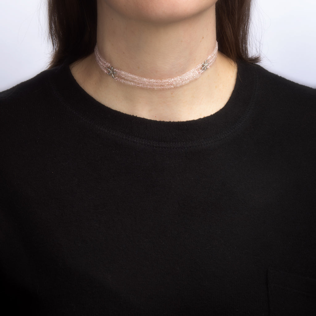 The beautiful necklace features three strands of soft pink hued rose quartz, faceted to shimmer with your every movement. The necklace is a choker length and small in size (13 inches). We encourage you to measure your neck to ensure a proper fit.