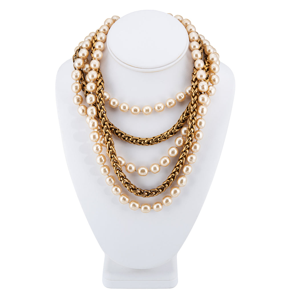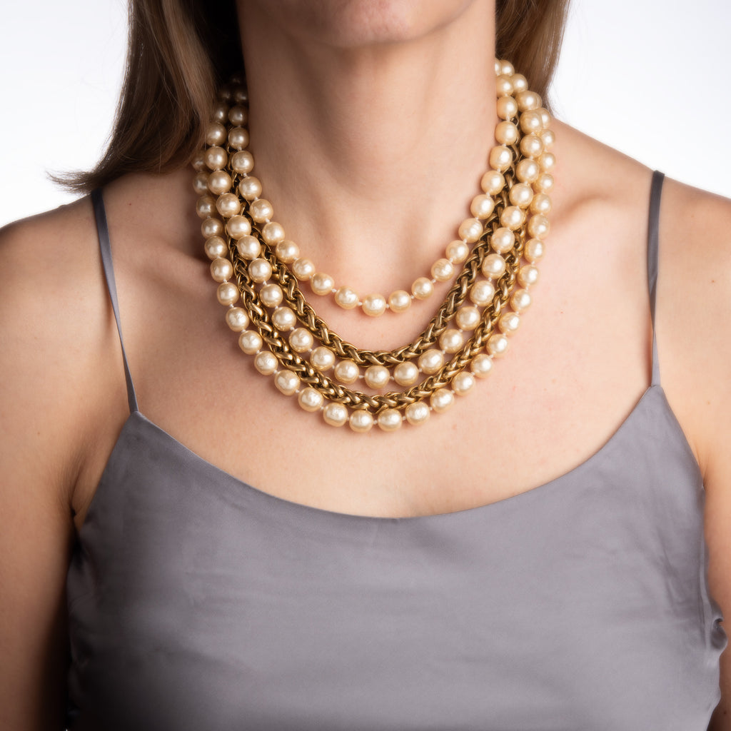 The necklace features 3 strands of 10mm faux pearls with 2 strands of yellow gold plated wheat-style chains. Measuring 17 inches in length the necklace is slightly adjustable to 19 inches. Given the multiple strands (and the thickness of the chain metal and faux pearl strands), the necklace sits shorter on the neck as a choker style. The faux pearls are in very good condition (no chips or flaking).
