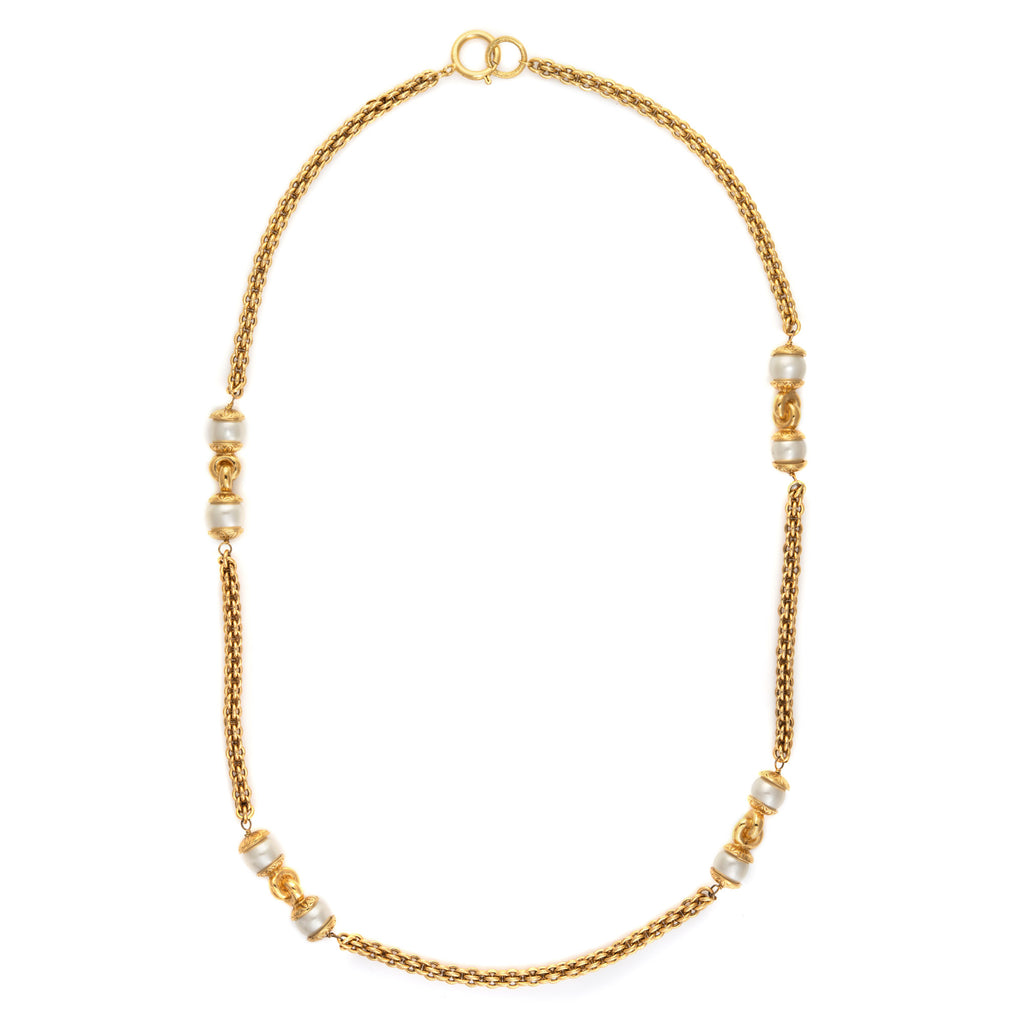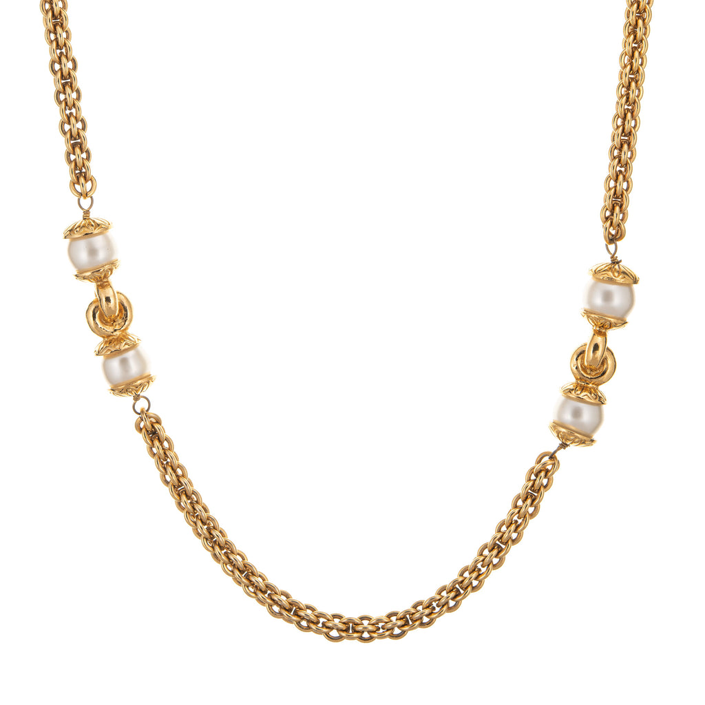 Vintage 80s Chanel faux pearl station necklace crafted in yellow tone (circa 1980s).