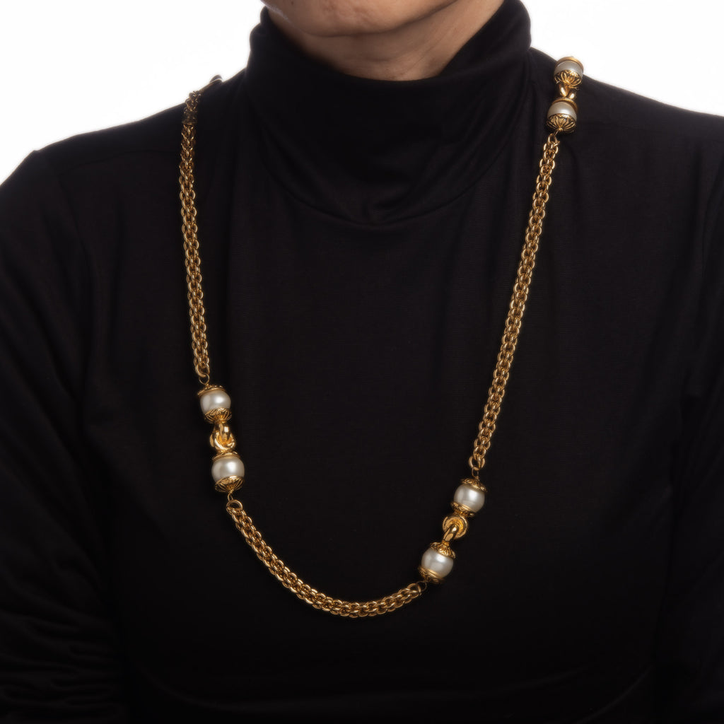 The necklace features faux pearls measuring 13mm each, with eight repeating textured gold orbs with inset pearls. Measuring 35 inches the necklace can be worn as a long strand or wrapped as a double strand. The faux pearls are in very good condition (no chips or flaking). The chain link measures 7mm.