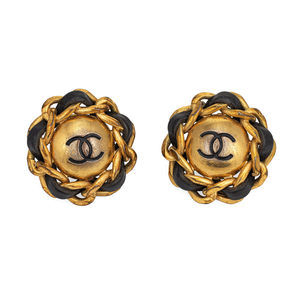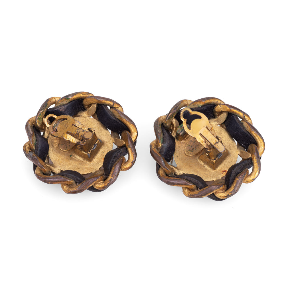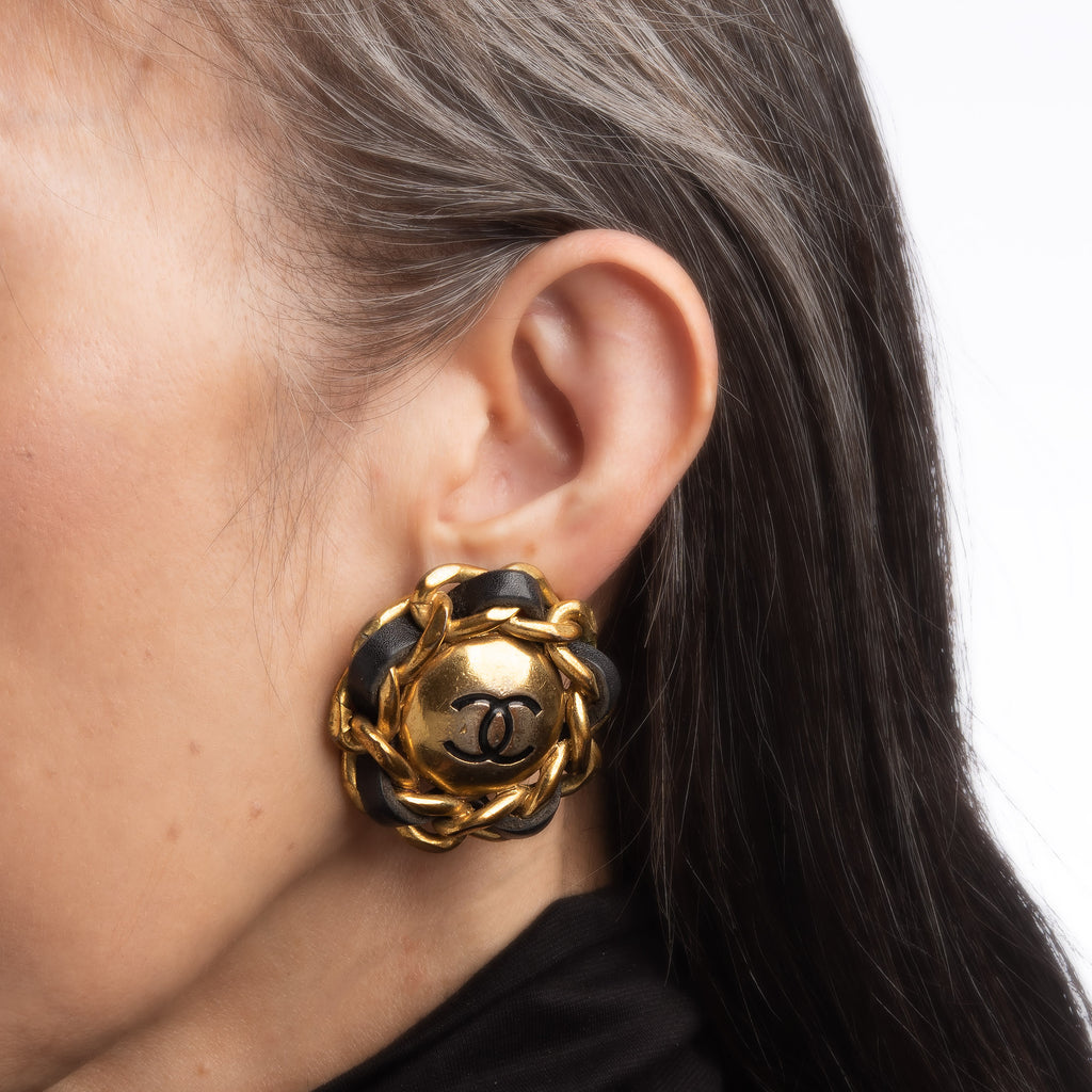 The large oversized jumbo earrings (1.65 inches diameter) feature the CC logo, bordered with a leather chain link. The earrings are fitted with clip-on backings for non-pierced or pierced ears. The earrings date to 1993 (Autumn) and are a great example of 90s era Chanel jewelry.