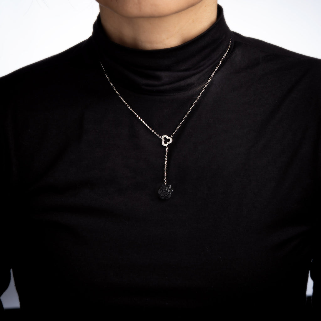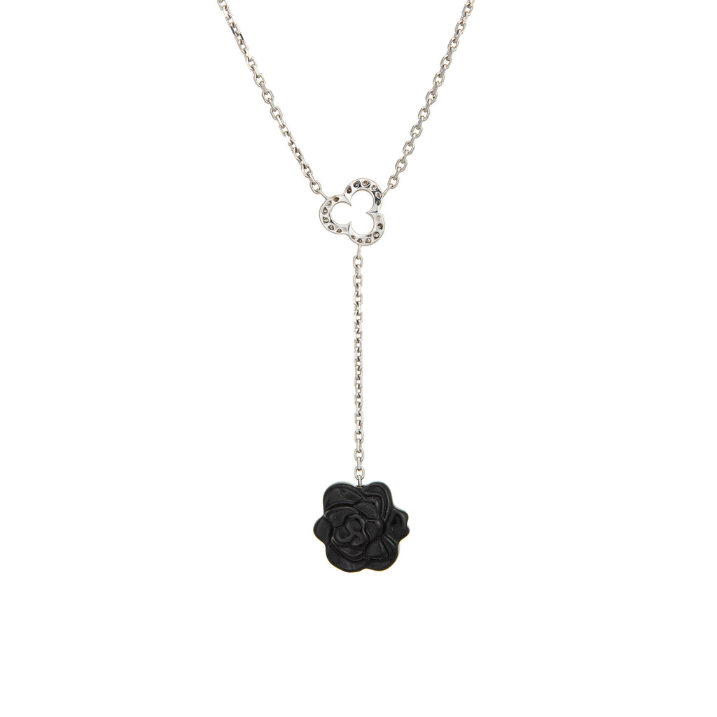 The classic Chanel necklace features a carved onyx Camellia Sculpte flower suspended at the base with a diamond set petal above. The piece is designed by Lorenz Baumer, a gifted jewelry designer who has also designed for Louis Vuitton. The necklace is great worn alone or layered with your fine jewelry from any era.