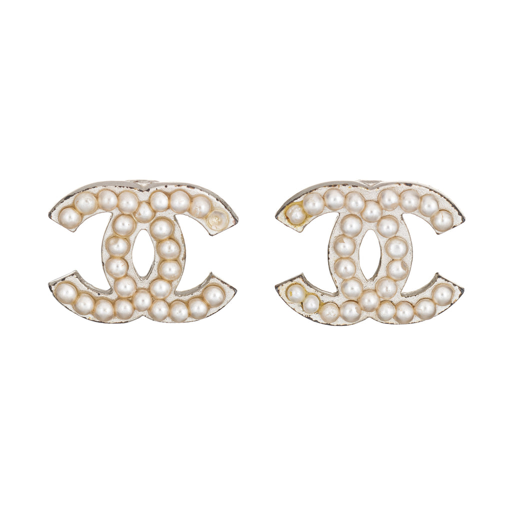 Chanel CC Logo Faux Pearl Earrings Clip On Silver Tone c2003